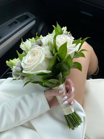 Состав свадебного букета: роза 7 шт, роза кустовая 4 шт, гипсофил 2 шт, порт ручка и пелерина.