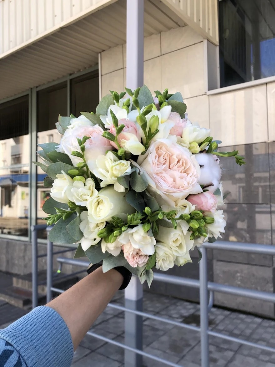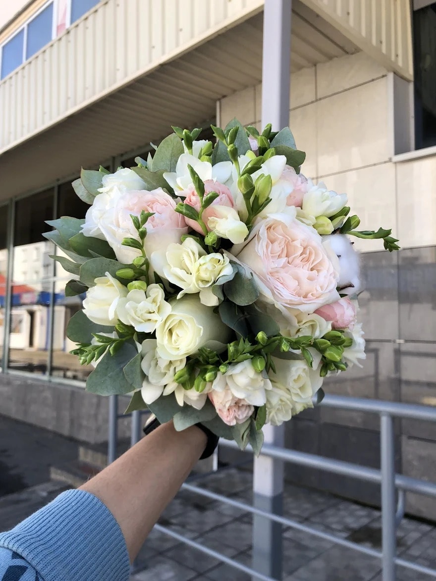 Состав букета из фрезий "Свадьба": роза, фрезия, роза пионовидная, роза кустовая, эвкалипт, техническая зелень.