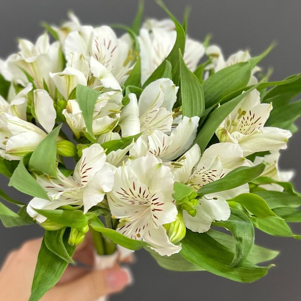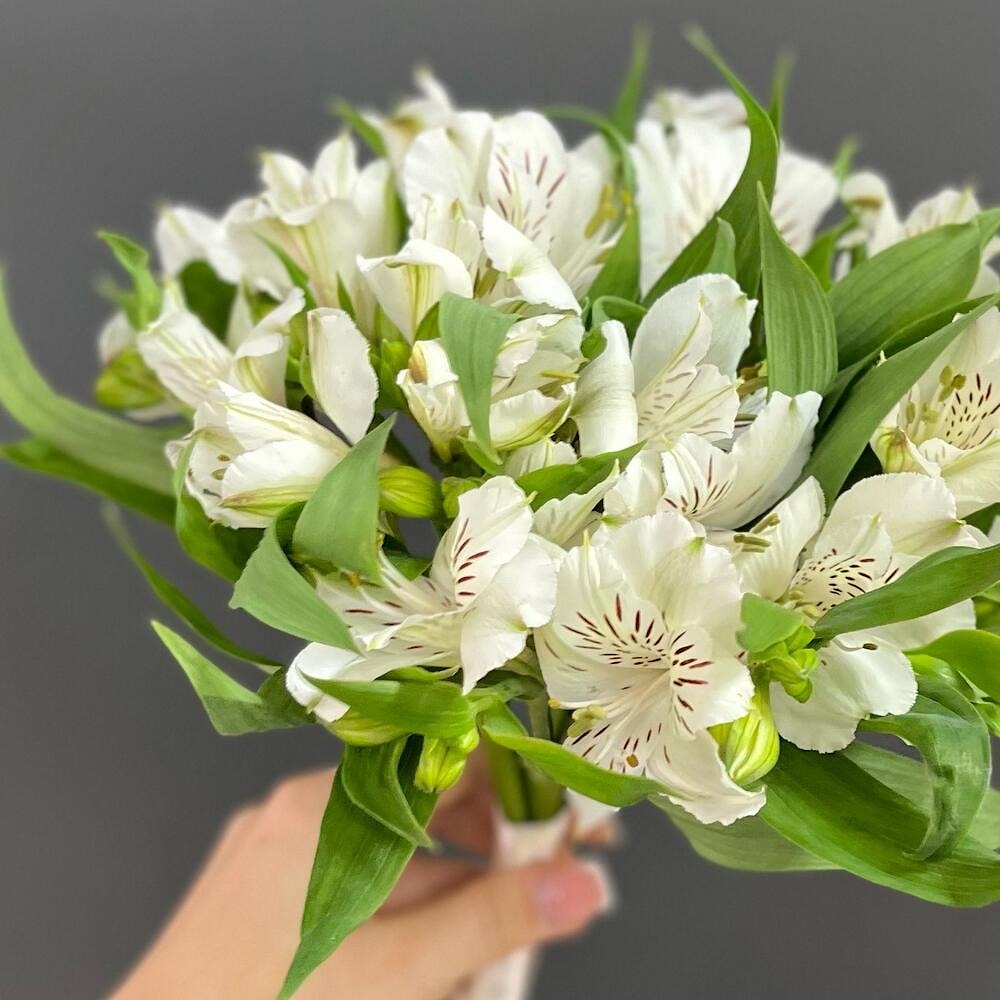 Состав этого утончённого свадебного букета — 5 белоснежных альстромерий, символов чистоты, верности и искренности. Лёгкая воздушная форма, элегантная лента и акцент на естественную красоту делают его стильным решением для современной невесты.