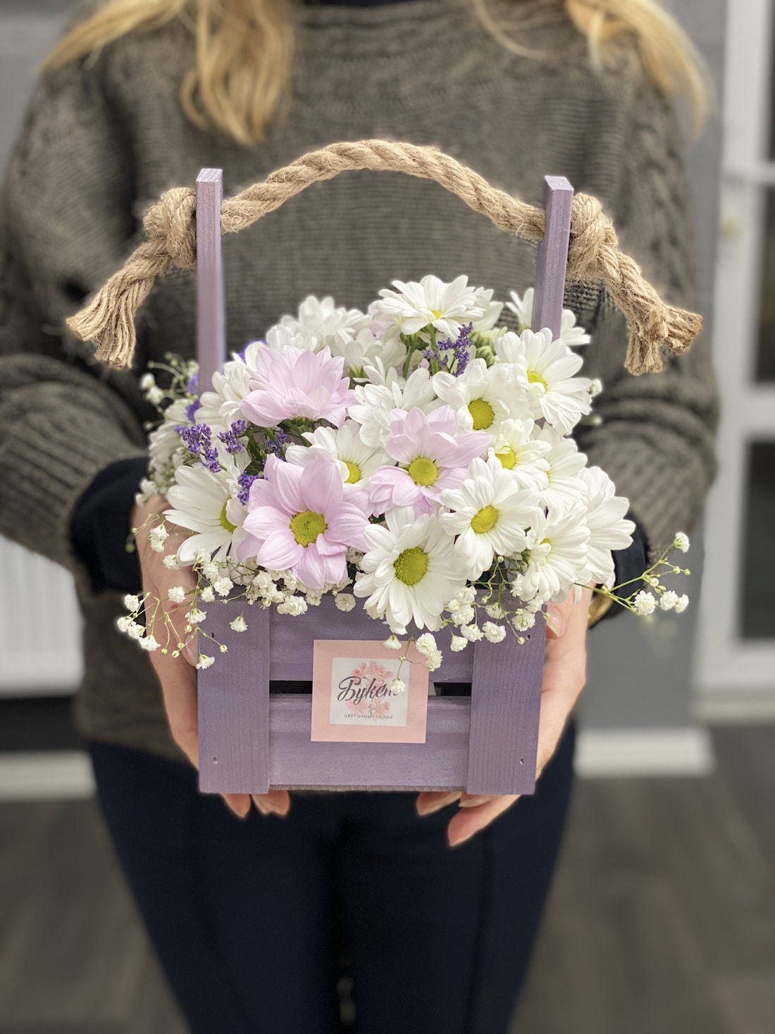 Хризантемы — символ солнца, излучающие тепло и свет, они наполняют деревянную коробку золотистым сиянием. Ромашки добавляют нотку невинности и простоты, их белоснежные лепестки с желтой серединкой напоминают маленькие солнечные лучики. Гипсофила, с её мелкими цветами, словно облака, создает ощущение легкости и воздушности. Вместе эти цветы создают гармоничное сочетание, отражающее красоту природы и наполняющее пространство свежестью и ароматом. Деревянная коробка придает всему ансамблю уют и теплоту, делая его идеальным подарком или украшением для дома.