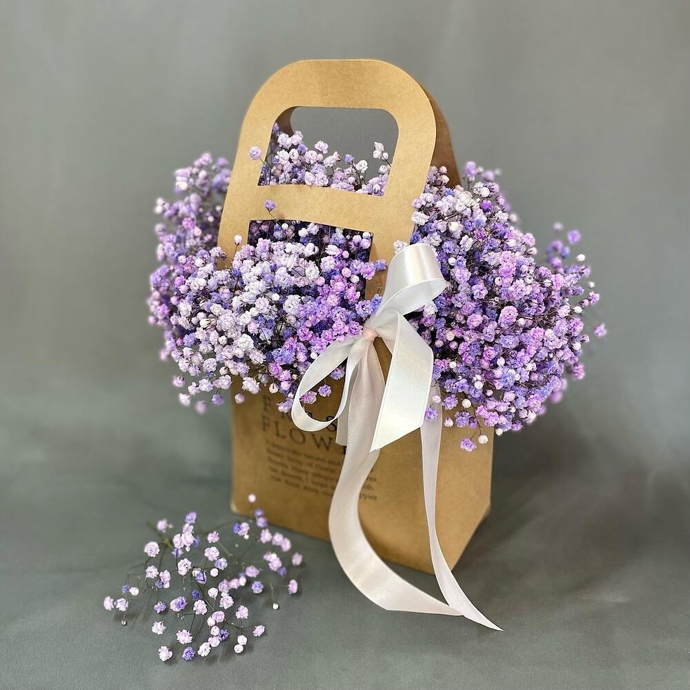 Ищете оригинальный подарок, который удивит и запомнится? Выберите сумочку из цветной гипсофилы – это лёгкая, воздушная и невероятно стильная композиция, оформленная в компактную дизайнерскую упаковку в форме сумочки.