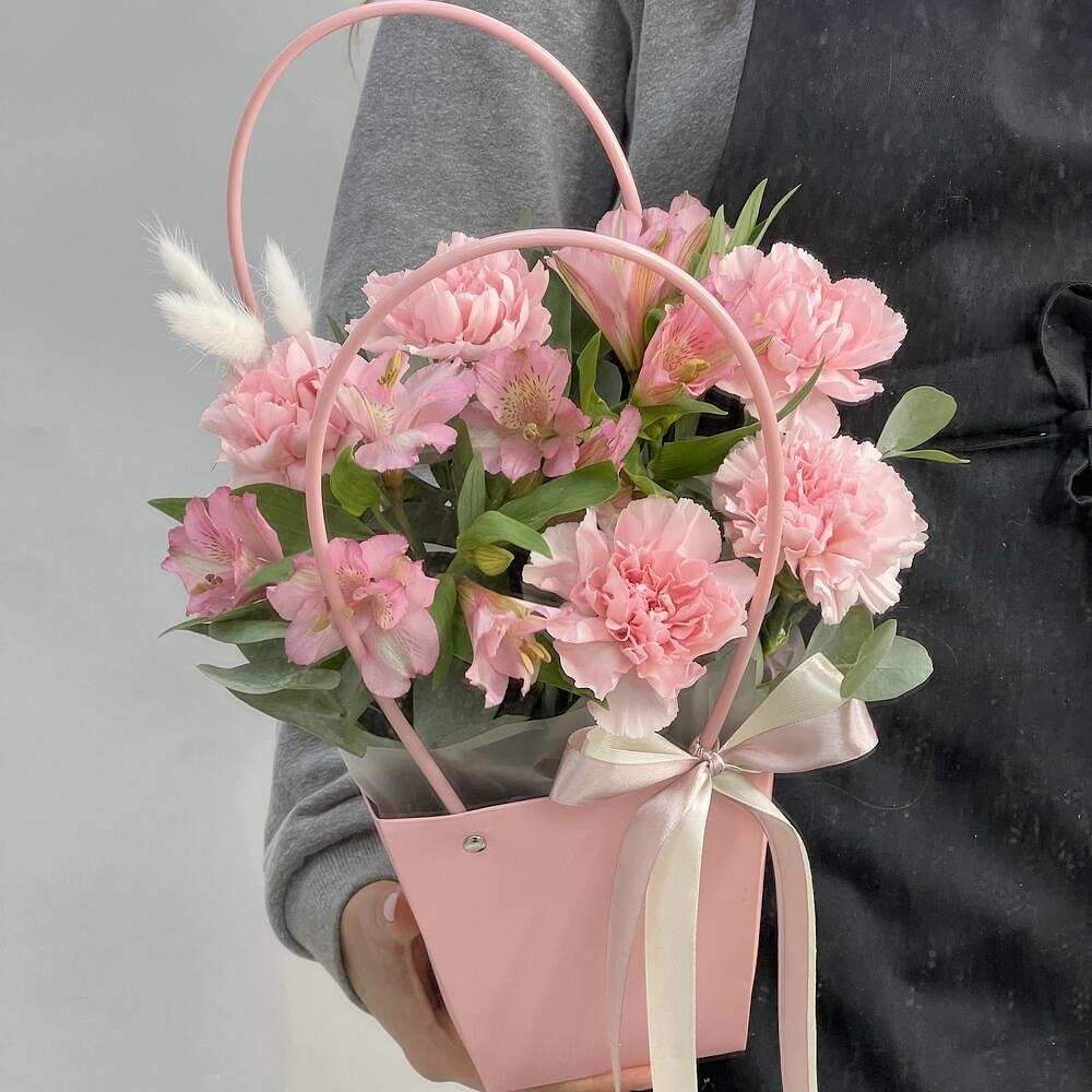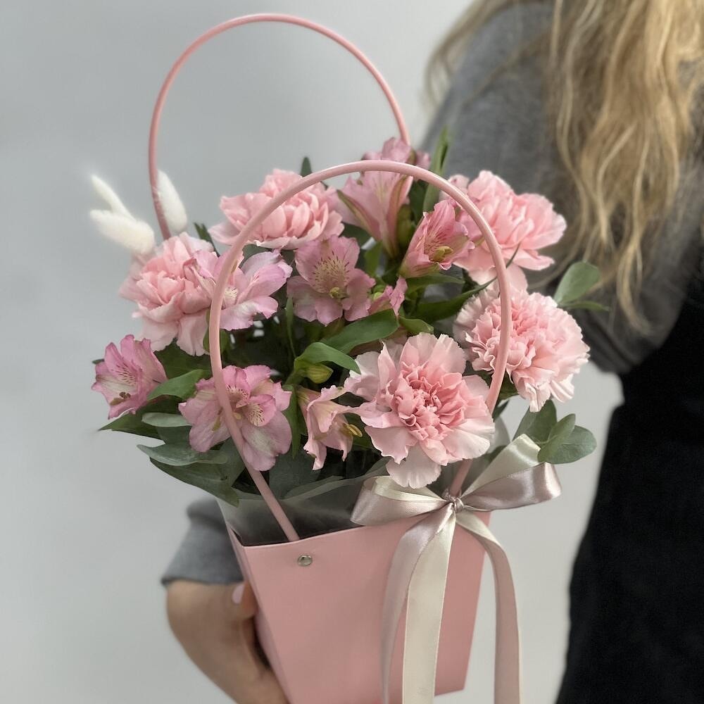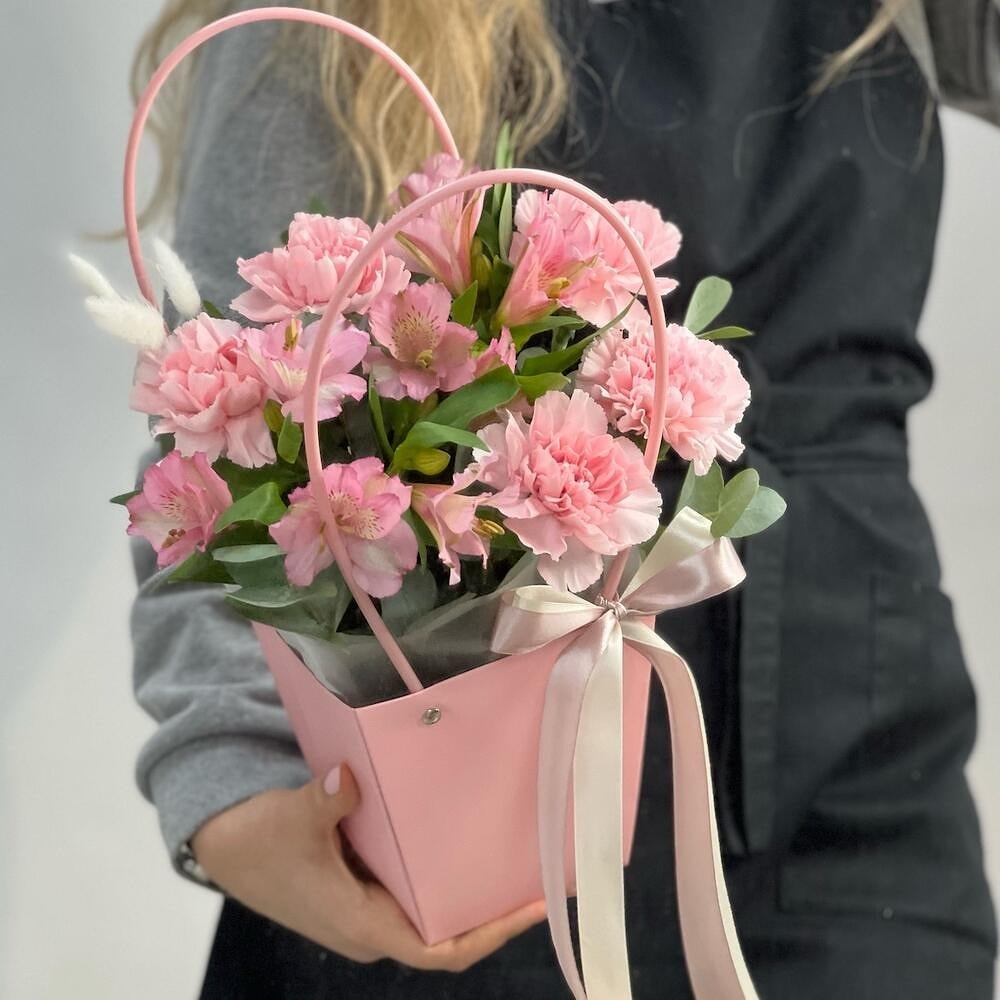 Цветочная сумочка с диантусами и альстромериями — нежность и стиль с доставкой по Полоцку и Новополоцку