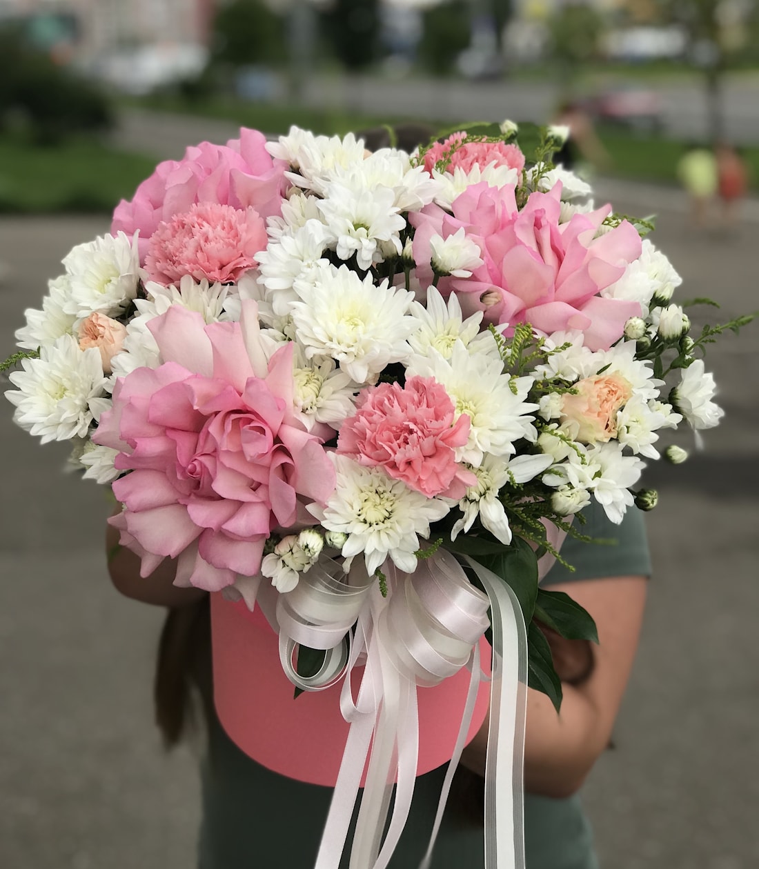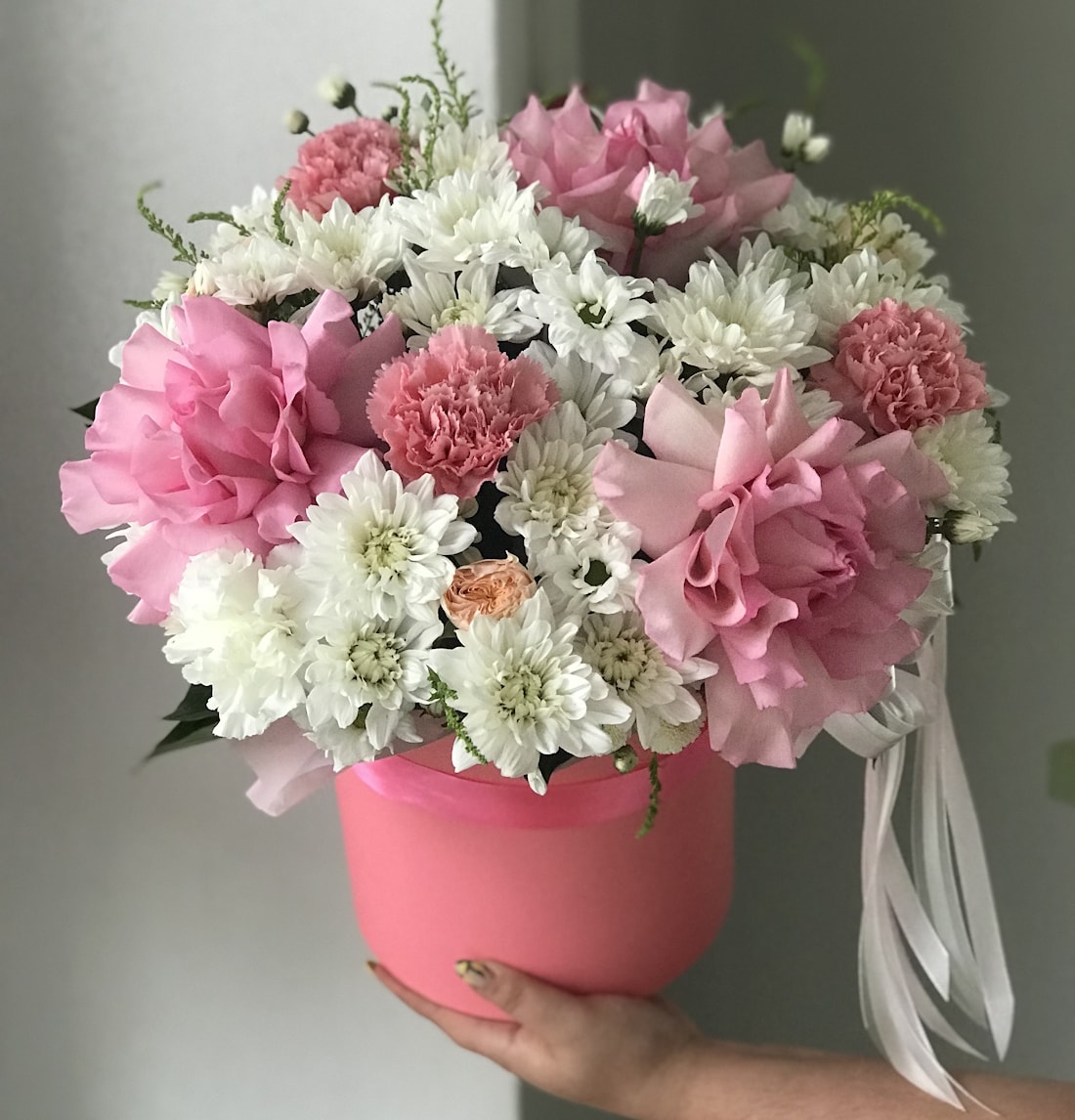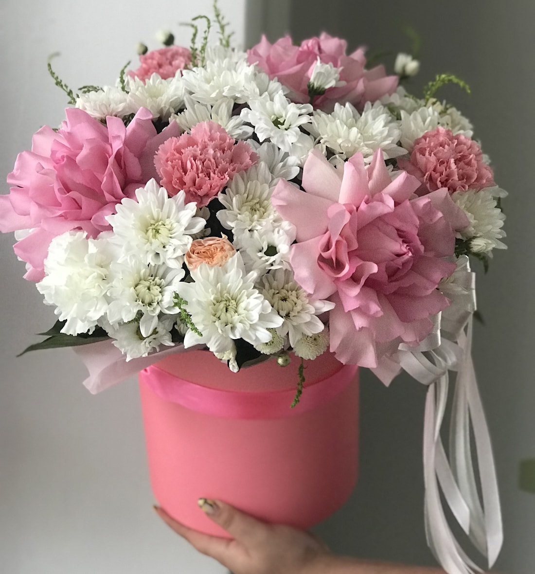 ФлораBox – стильная цветочная коробка с доставкой в Полоцке и Новополоцке. В композиции собраны 3 нежные розовые французские розы, 3 диантуса и белая хризантема. Такой букет в коробке идеально подойдёт для подарка девушке, маме, подруге или коллеге. Нежные оттенки цветов создают атмосферу уюта и романтики, а аккуратная упаковка делает композицию особенно презентабельной.