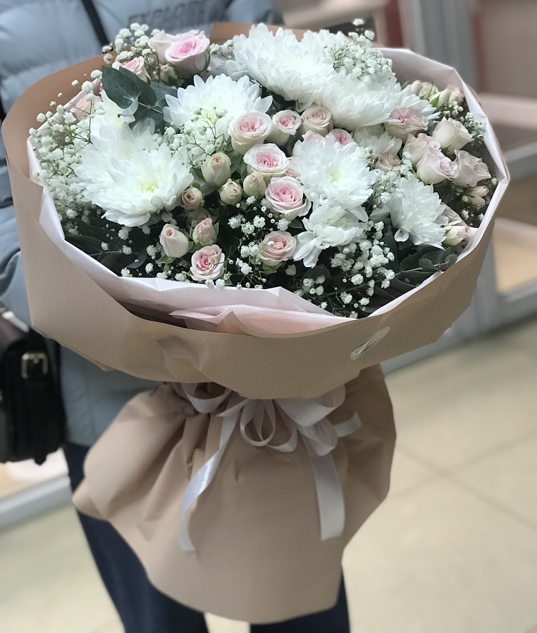 🌸 Букет из 3 нежных хризантем, воздушной гипсофилы и 5 кустовых роз — это сочетание элегантности и уюта. Белоснежная гипсофила придаёт композиции лёгкость и романтичность, а розы и хризантемы создают гармонию нежных оттенков и праздничного настроения. Такой букет подойдёт для поздравления с любым событием или просто для того, чтобы порадовать близкого человека без повода.