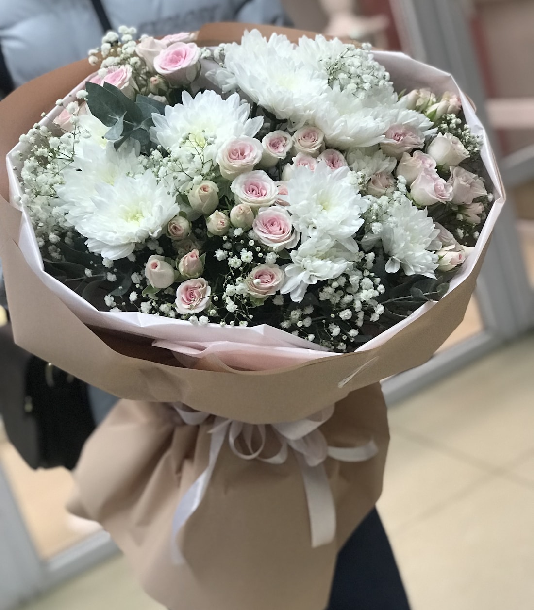 Состав букета: 3 ветки хризантемы, 5 веток кустовой розы, 2 ветки гипсофилы