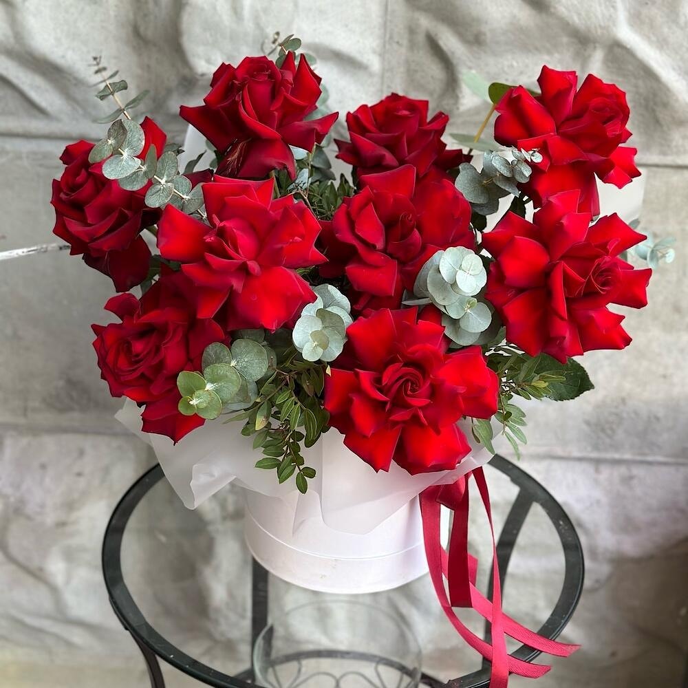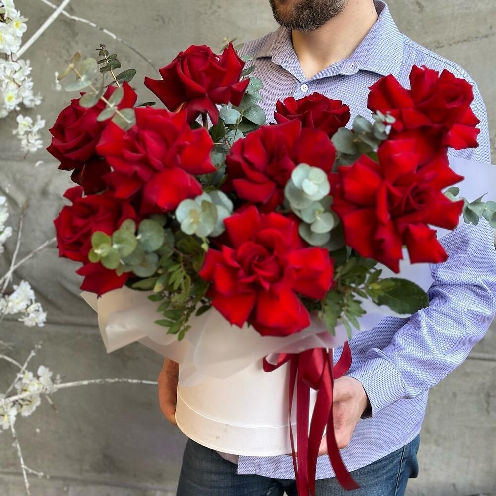 Покажите свои чувства через роскошь живых цветов. Элегантная композиция из красных французских роз премиум-класса с эвкалиптом в стильной коробке – это безупречный подарок, который говорит о любви, уважении и заботе.