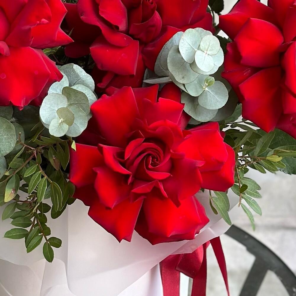 Насыщенные красные розы символизируют страсть и восхищение, а свежий эвкалипт придаёт букету изысканности и лёгкий аромат природы.