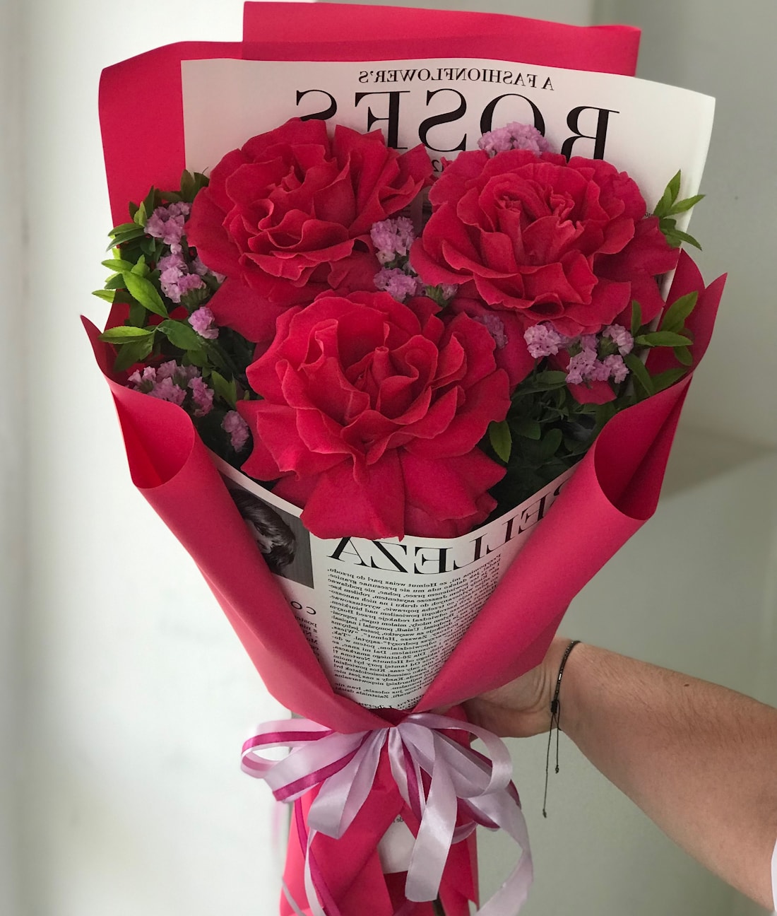 Букет из трёх малиновых французских роз с изящной зеленью — лаконичный и стильный подарок, который говорит о чувствах без лишних слов. Идеален для нежного признания, комплимента или просто знака внимания.