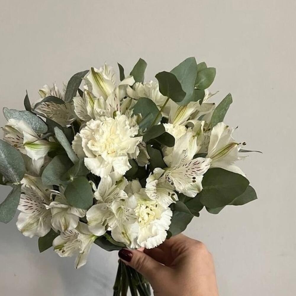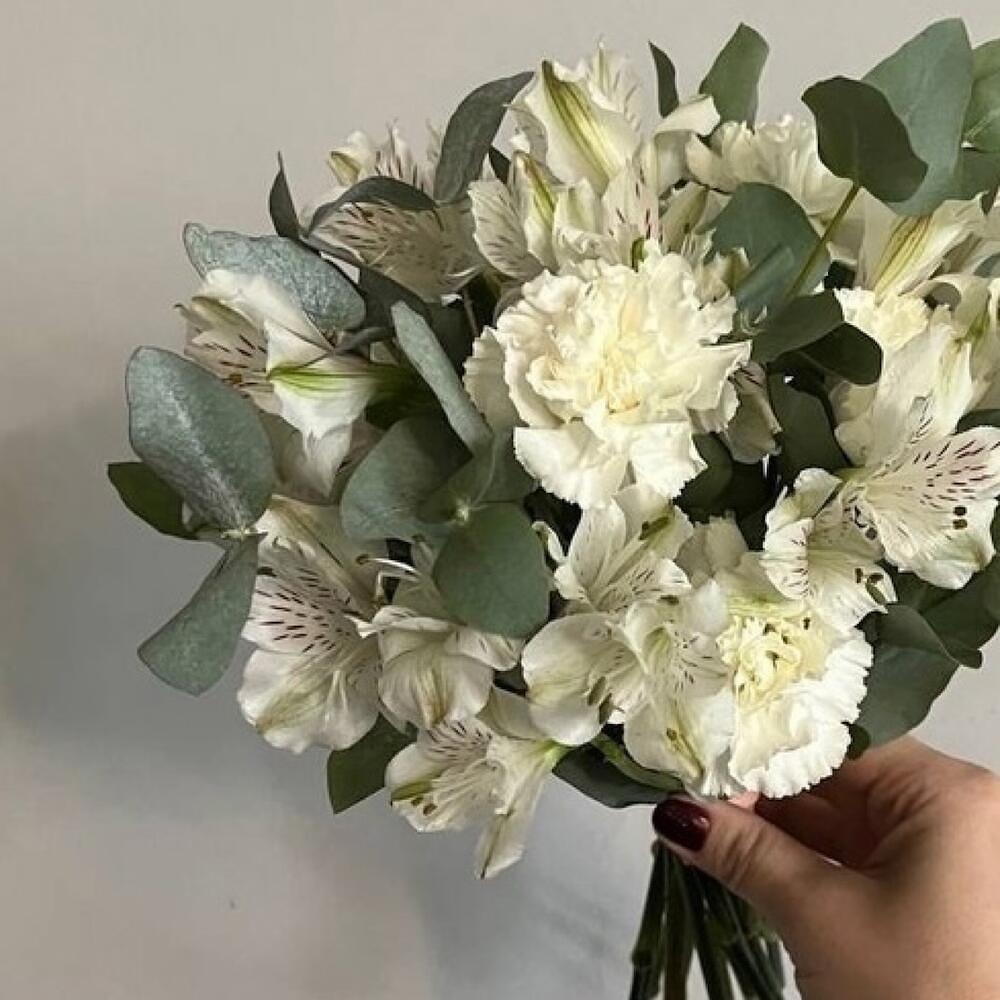 Белоснежные альстромерии символизируют верность и дружбу, а изысканные диантусы придают композиции воздушность и объем. Ароматный эвкалипт добавляет модную зелёную ноту, придавая букету стильный, слегка богемный акцент.