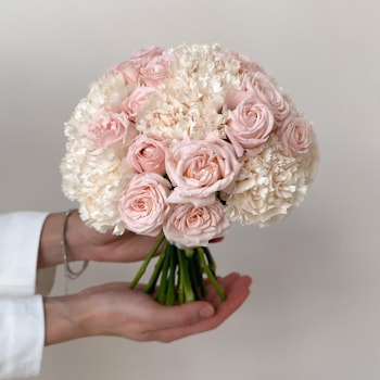 Свадебный букет невесты "Живой" отлично смотрится в кругу свадебных гостей! Розовая, кремовая и белая роза делает композицию нежной и элитной. Благодаря умелым рукам флористов, свадебный букет невесты не теряет формы и цвета в течении нескольких дней. Состав букета: роза 7шт, роза кустовая 5шт, лизиантус 3шт, хамелациум и эвкалипт