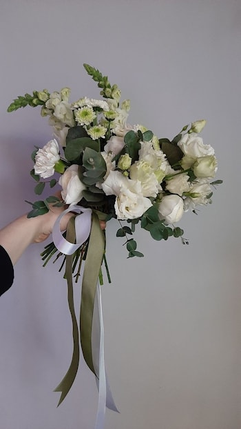 Букет невесты, сочетается с белым свадебным платьем и отлично смотрится на церемонии! Белая и воздушная роза делает композицию праздничной и благородной. Благодаря правильной форме, свадебный букет невесты не теряет формы и цвета. Состав букета: роза 7шт, роза кустовая 3шт, лизиантус 3шт, рускус 5шт