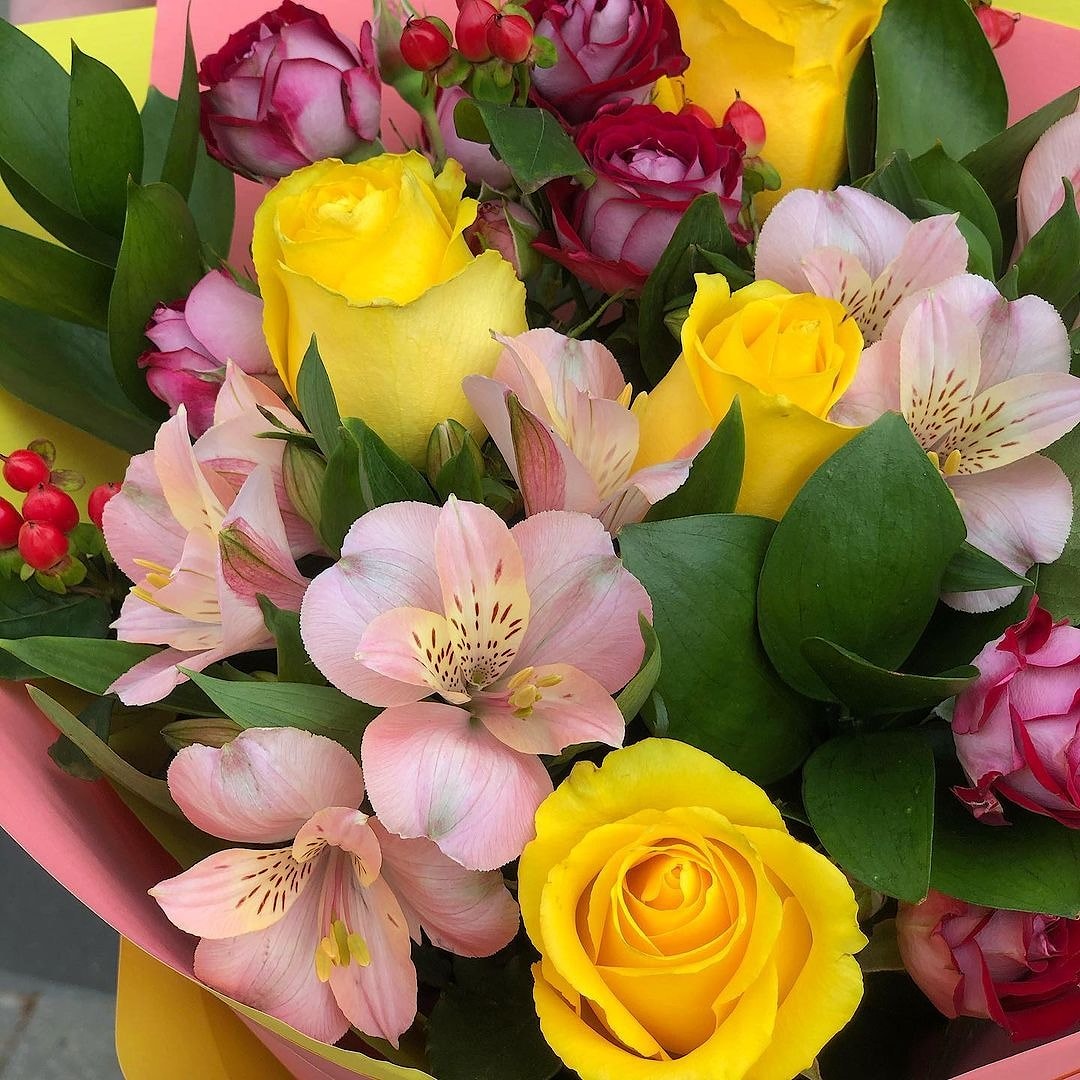 Если вы хотите купить в Полоцке или Новополоцке букет №6 Жёлтая роза, Красная Кустовая Роза и Альстромерия , вы можете
