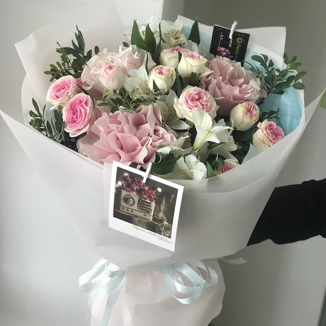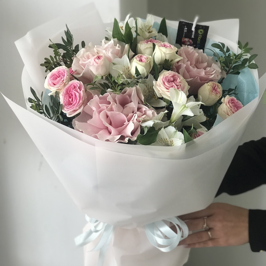 Букет с альстромериями, французскими розами и кустовыми розами — гармоничная композиция, в которой сочетаются изящество и объём. Французские розы придают букету элегантность, кустовые розы добавляют пышности, а альстромерии — лёгкости и свежести. Такой букет выглядит стильно и современно, долго сохраняет свежесть и подойдёт для поздравления, свидания или тёплого знака внимания без особого повода