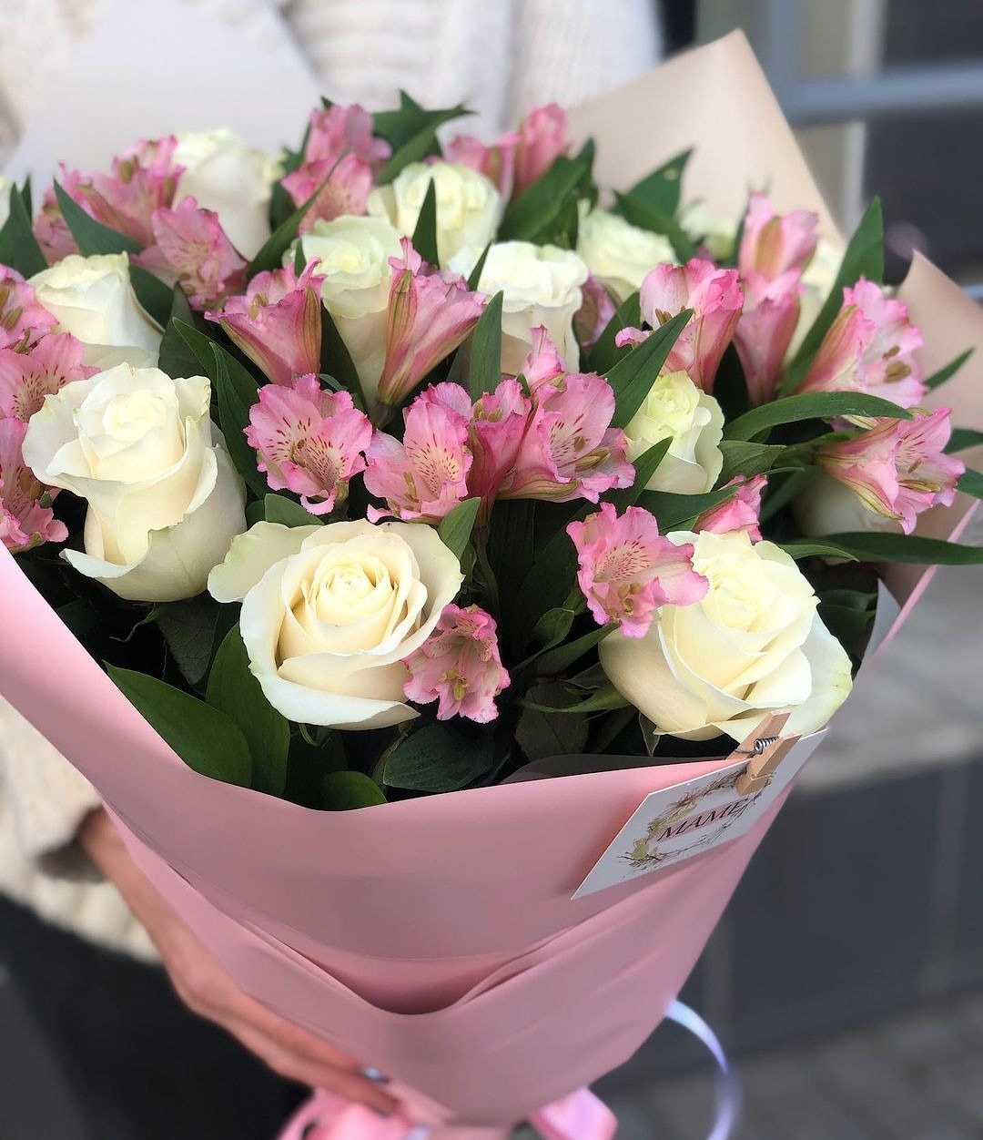 Букет №21 – Прекрасный Букет с Белой Розой и Альстромерией