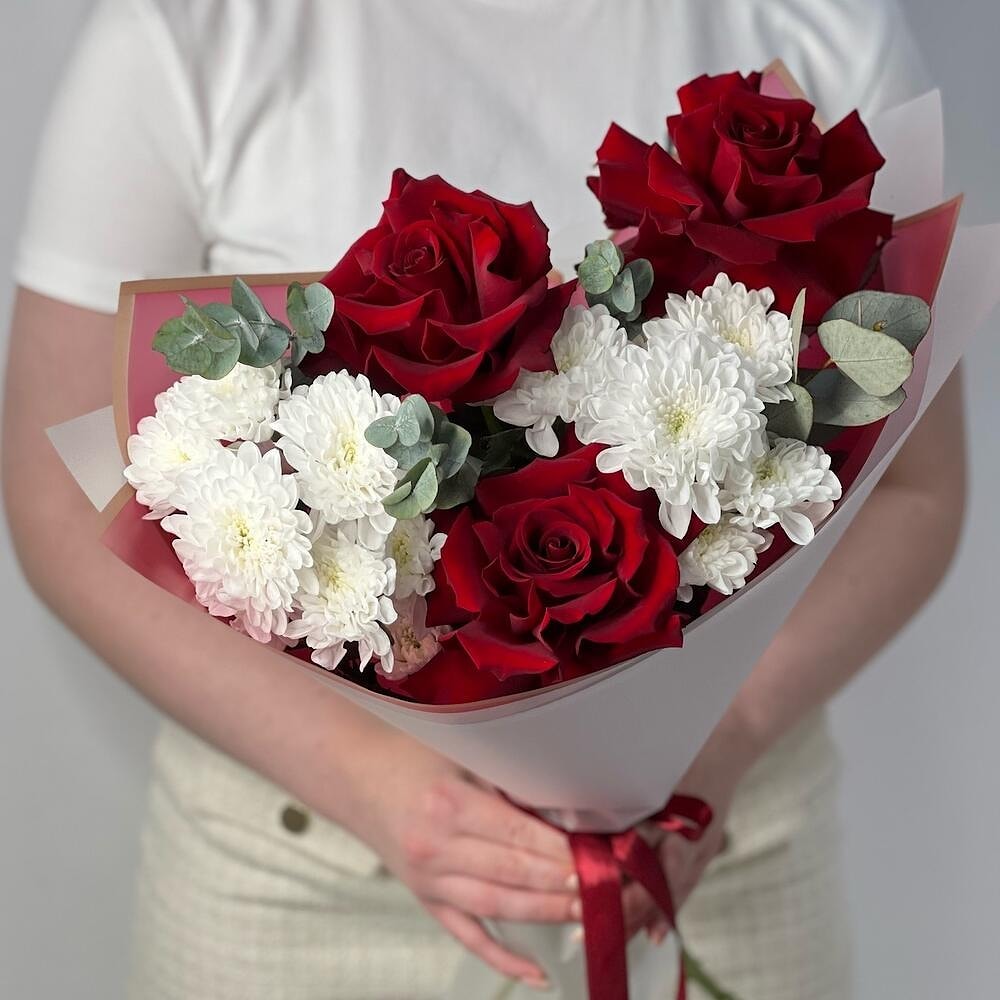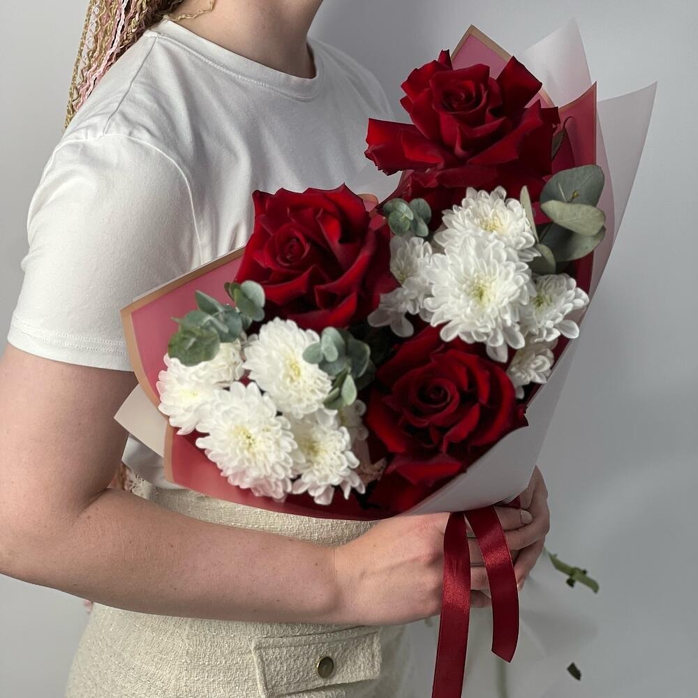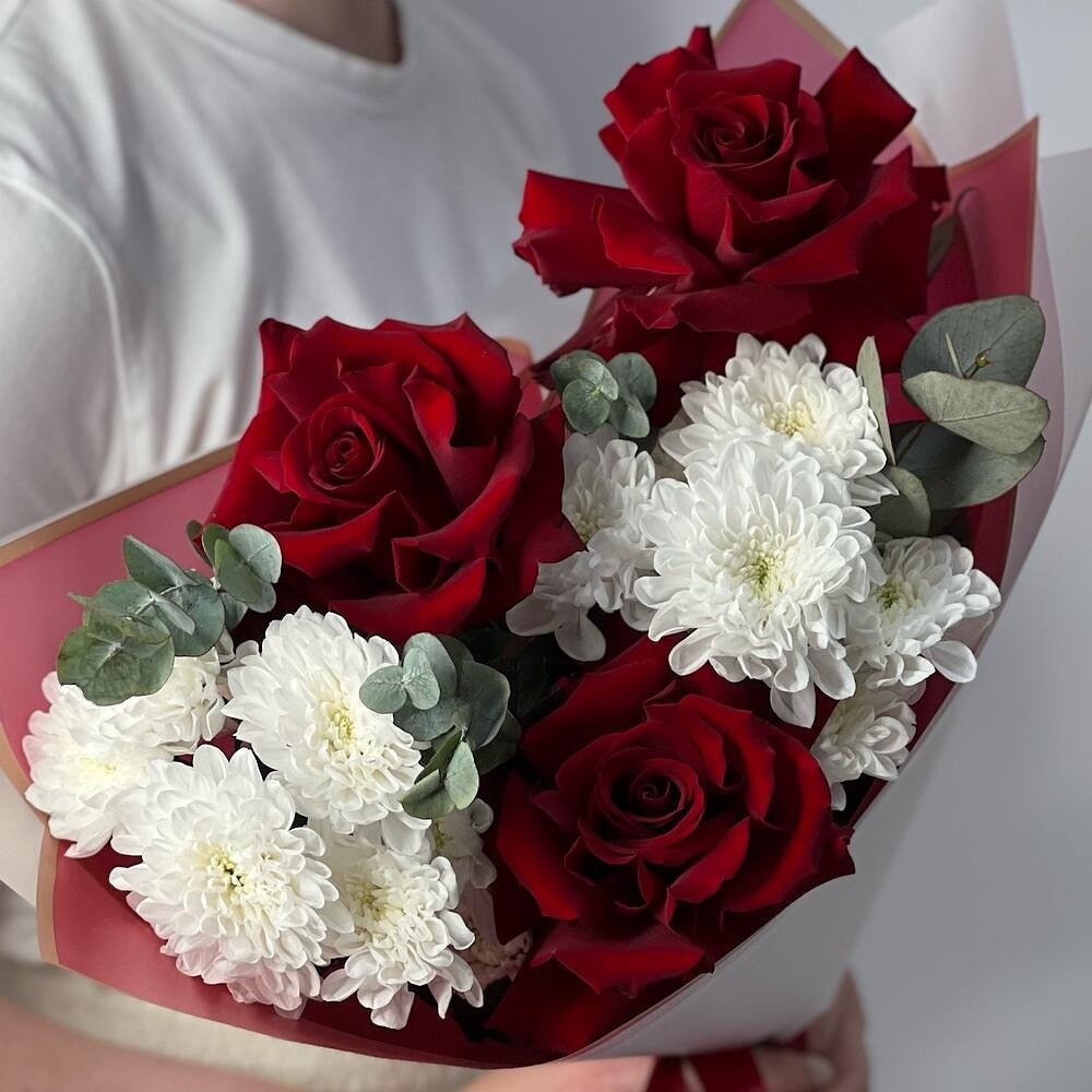 Букет из 2 белоснежных хризантем, 3 французских красных роз и нежной зелени — стильное сочетание классики и современности. Контраст белого и алого выглядит особенно эффектно, а элегантная упаковка подчёркивает вкус и чувство стиля.
