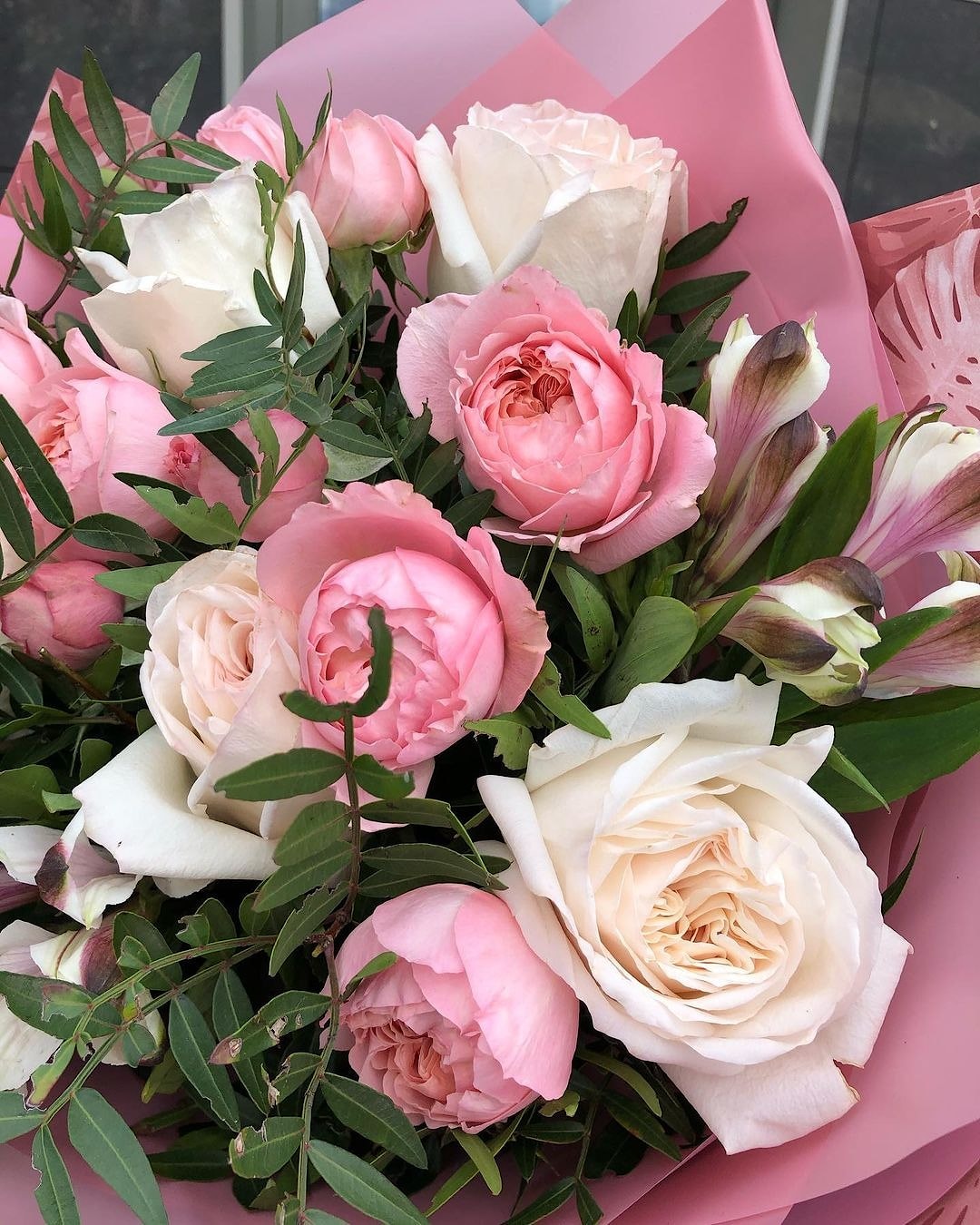 Состав: Букет из Кремовой 5шт, Кустовой Розы 2шт, Альстромерии 3шт и писташи