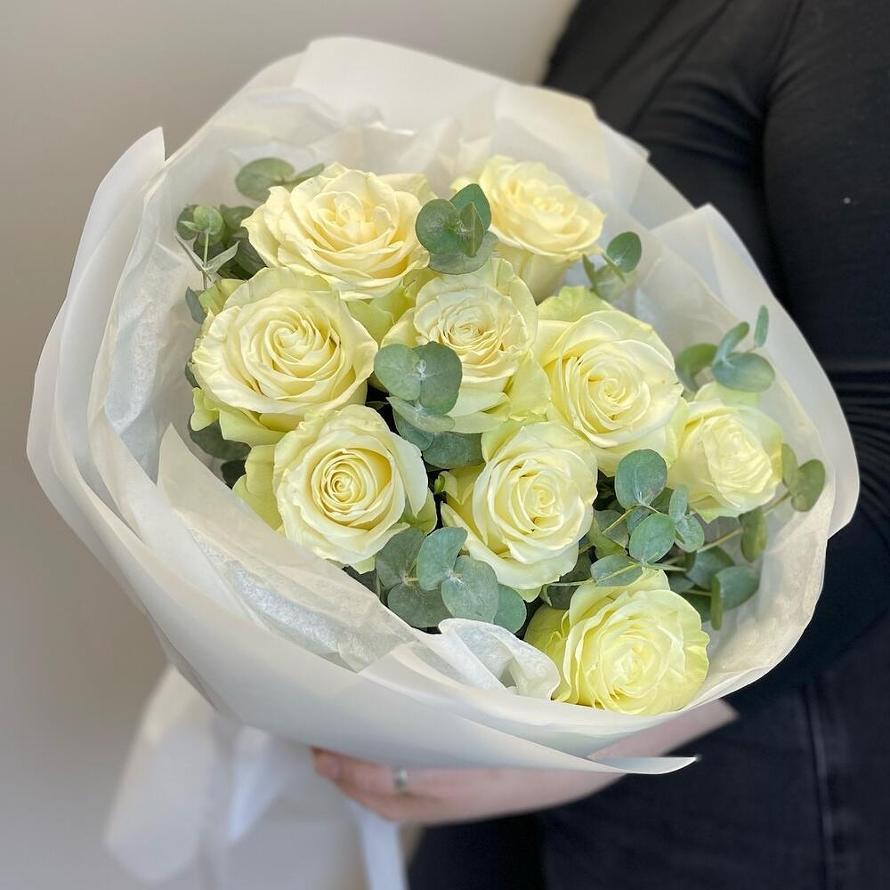 Если вы хотите купить в Полоцке или Новополоцке 9 белых роз Мондиаль с зеленью в стильной упаковке , вы можете