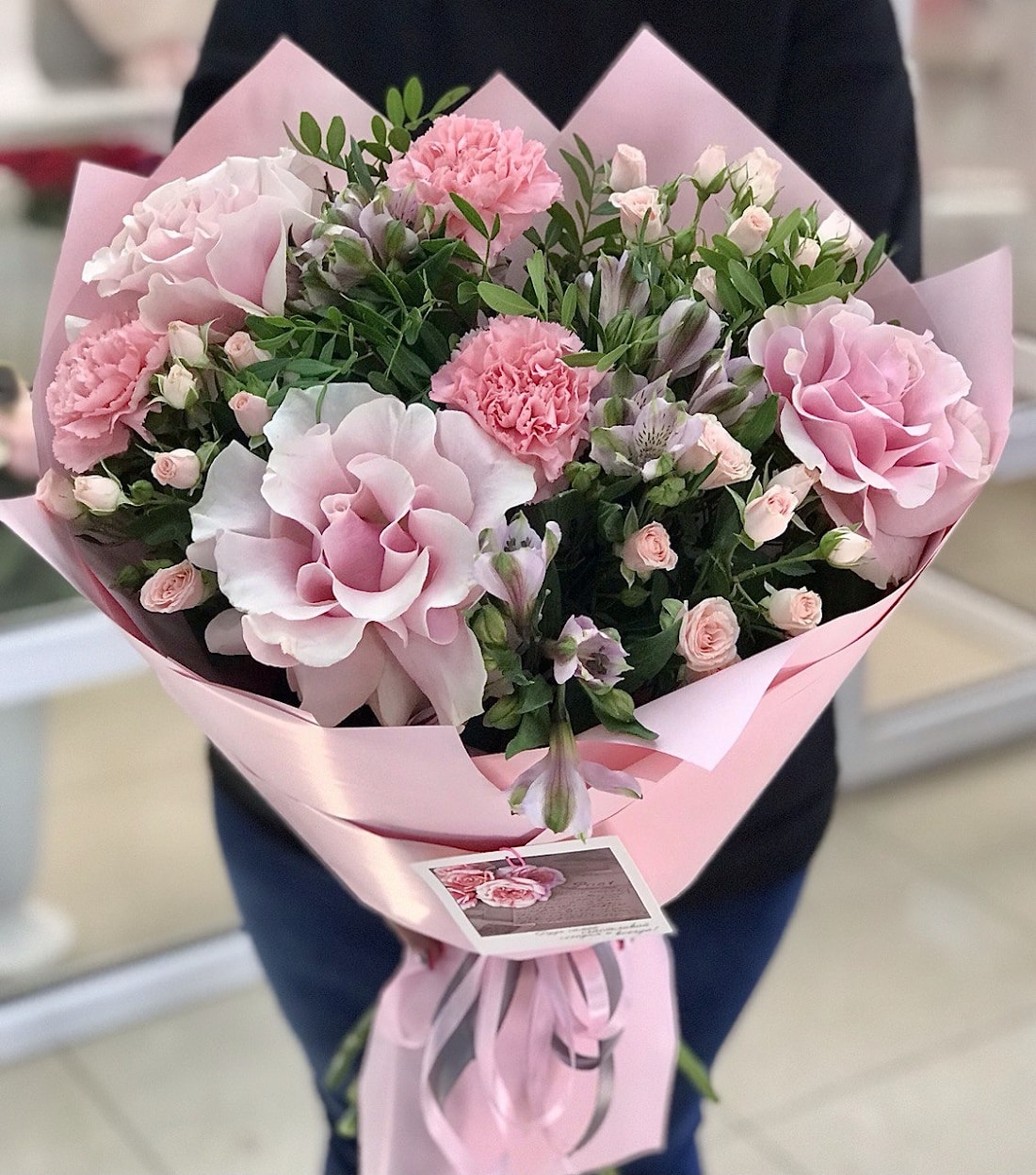 Состав: французская роза 3шт, кустовая роза 3шт, диантус 3шт, альстромерия 3 шт, зелень