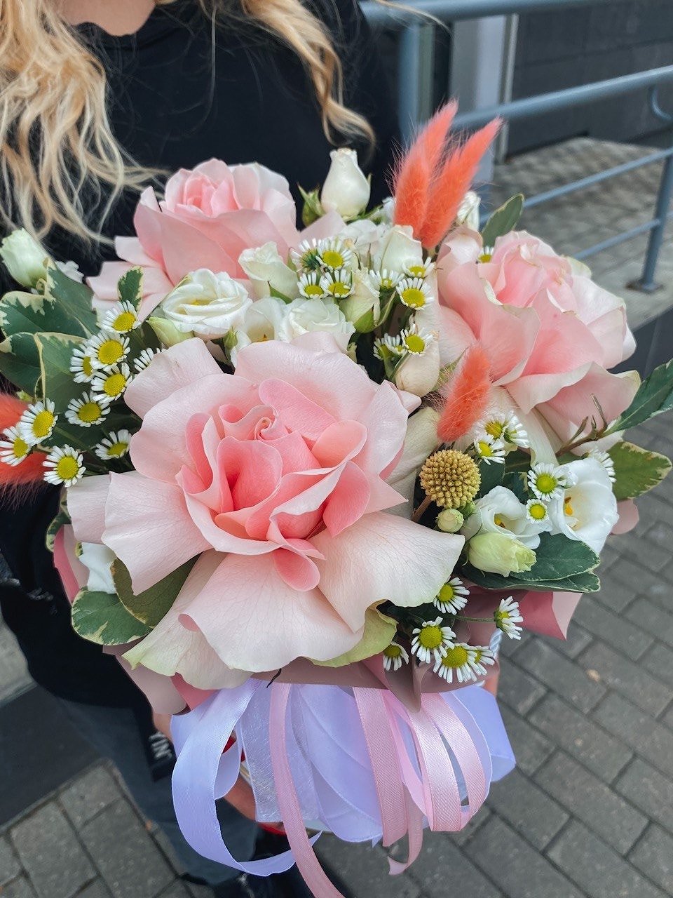 Состав: французская роза, эустома, хризантема сантини, зелень, сухоцветы