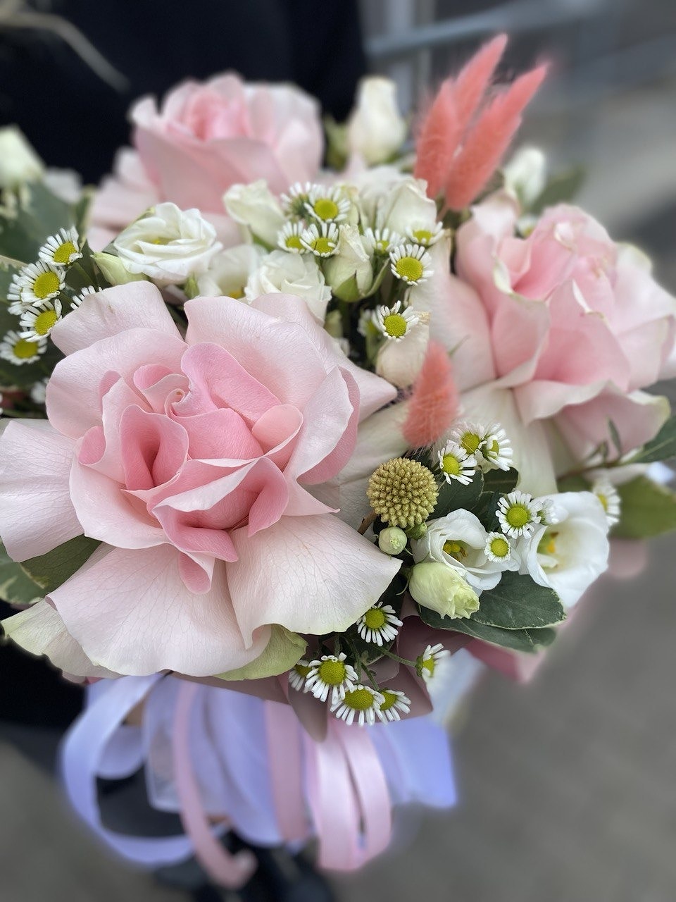 Состав Букета №64 "Французская Любовь" - французская роза, эустома, хризантема сантини, зелень, сухоцветы
