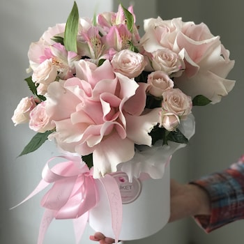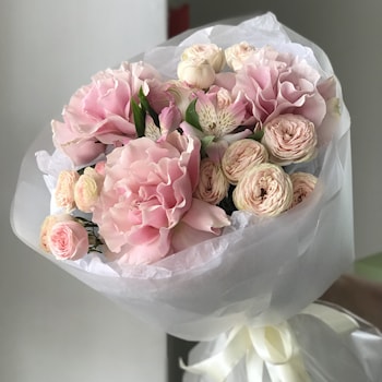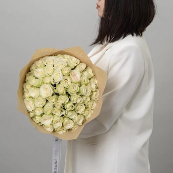 Состав: роза розовая, роза белая, гвоздика, эустома, эвкалипт