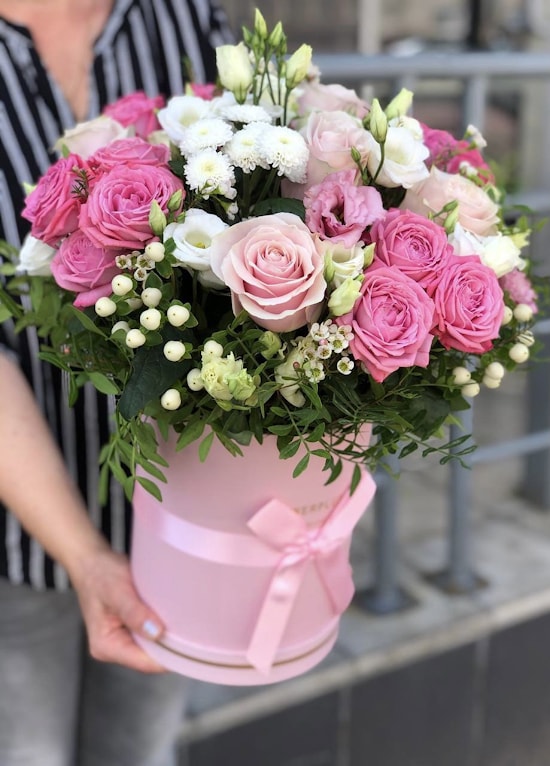 - Стильная шляпная коробка, только подчеркивает всю красоту такого букета.