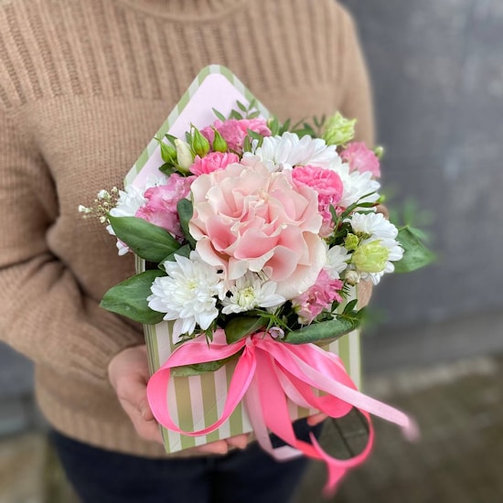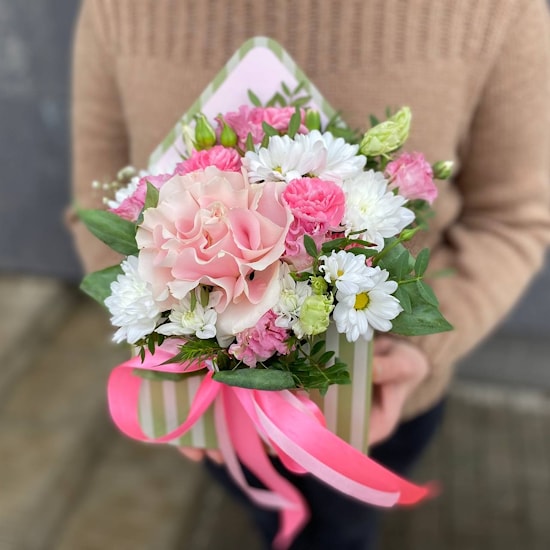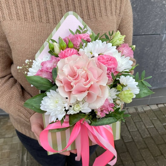 Состав: роза французская, эустома, гвоздика, хризантема и зелень