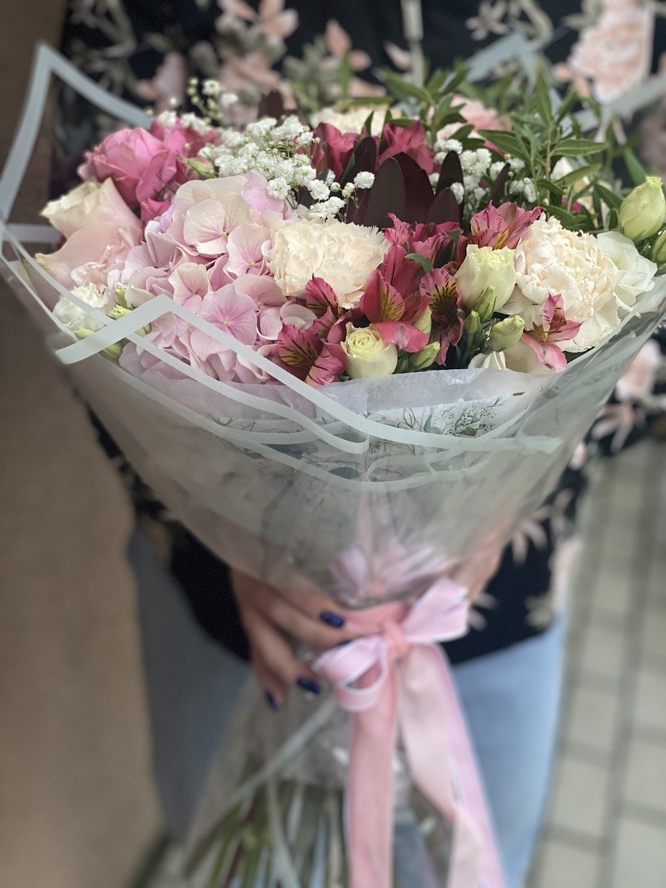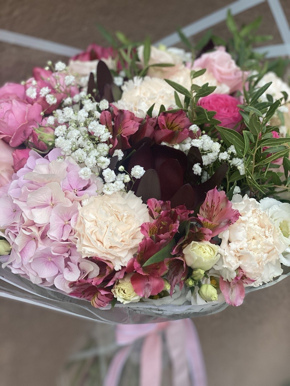 Состав: роза, леукадендрон, гвоздика, альстромерия, эустома, пионовидная кустовая роза, гипсофила и зелень