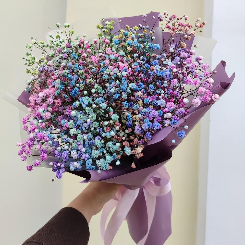 Букет с разноцветной гипсофилой — это лёгкость, нежность и настроение праздника в одном объёме. Воздушные облака мелких соцветий создают эффект невесомости и наполняют композицию мягкими оттенками: от пастельных до ярких акцентов. Такой букет выглядит свежо, стильно и очень фотогенично — идеально для подарка без повода, дня рождения, свидания или как комплимент, который поднимает настроение с первого взгляда.