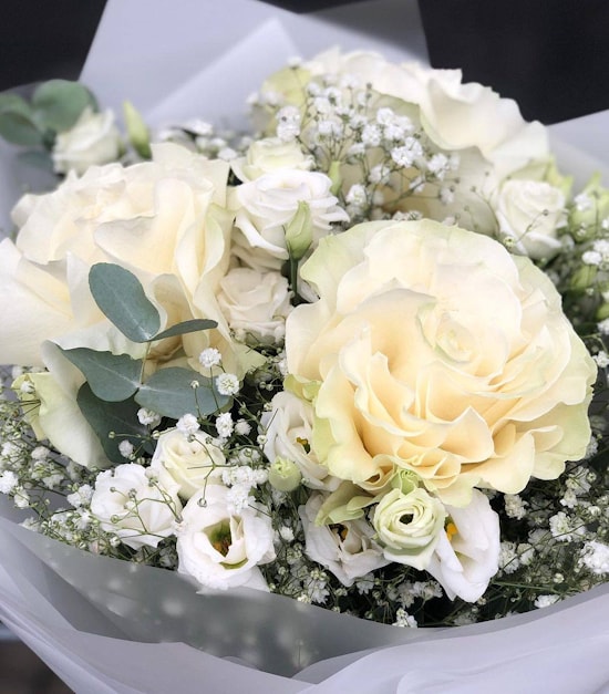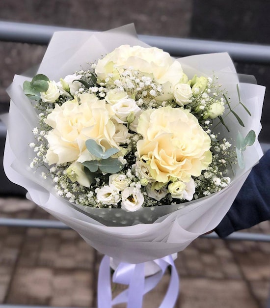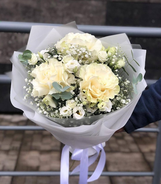Состав Букета №77 "Модный" - французская роза, эустома, гипсофила, эвкалипт