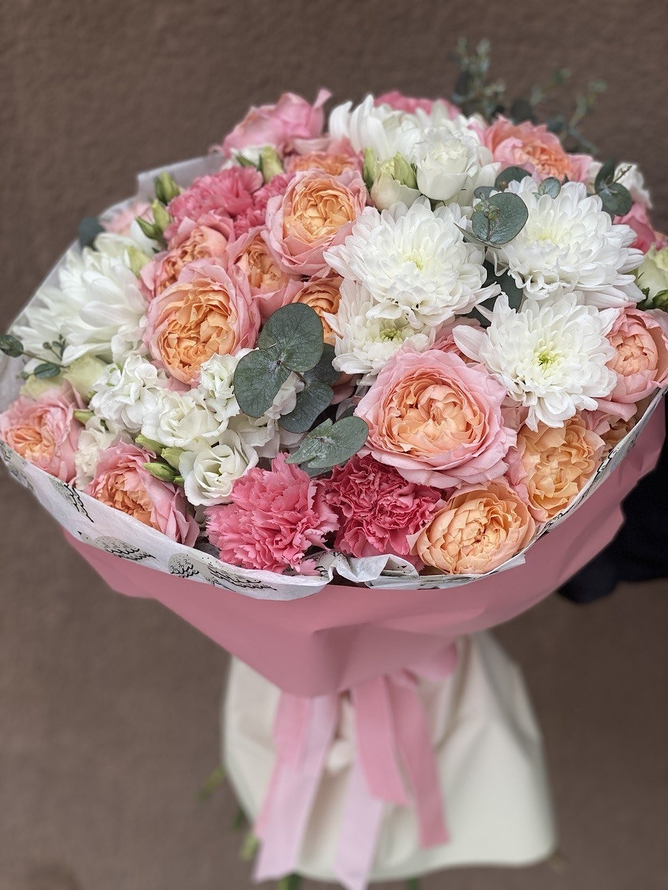 Состав: хризантема одноголовая, хризантема кустовая, пионовидная кустовая роза, гвоздика, эустома, матиола, эвкалипт