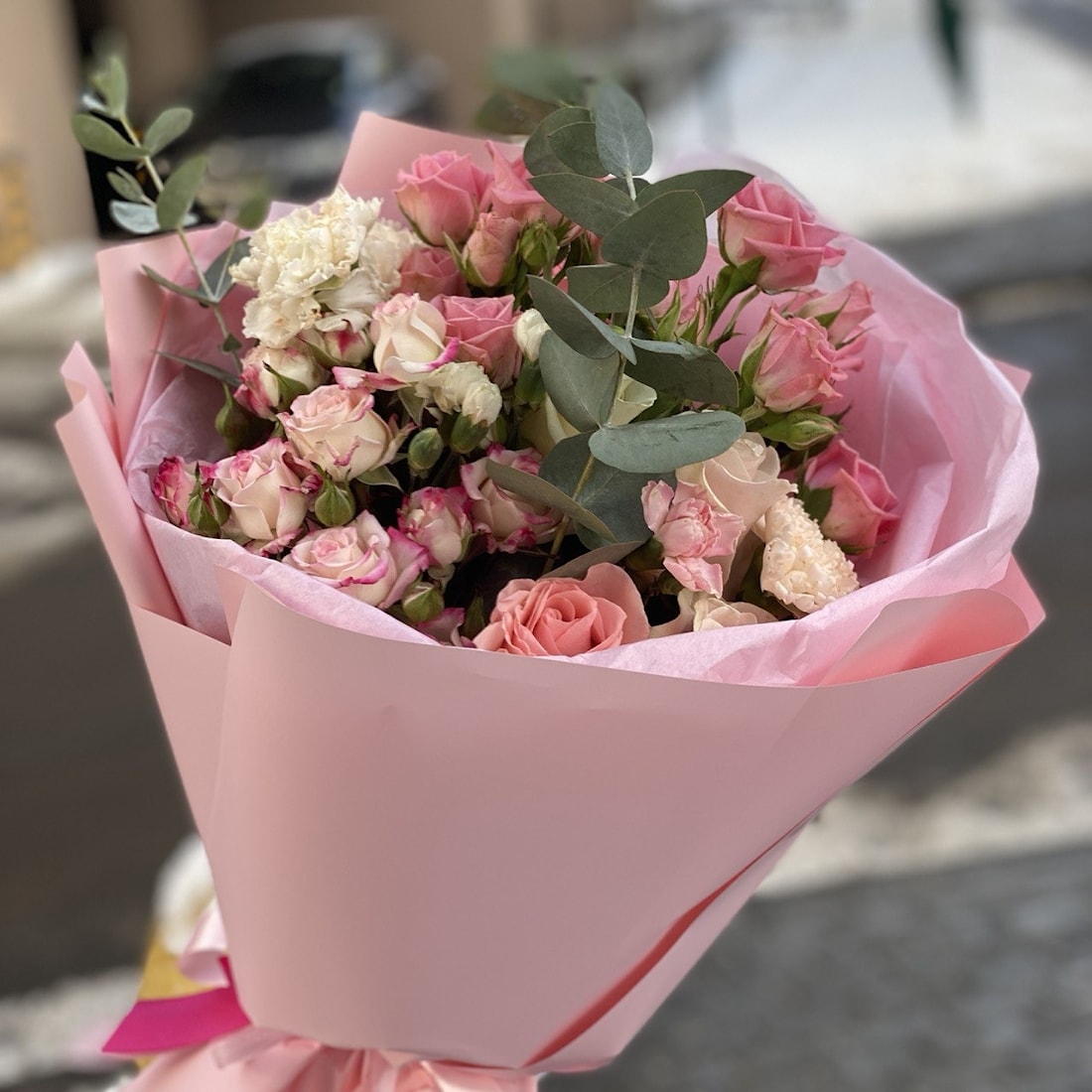 Состав: роза, кустовая роза, гвоздика, эвкалипт