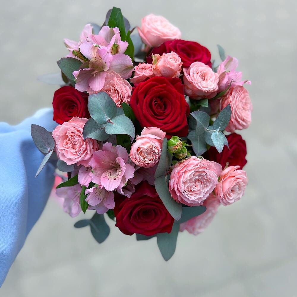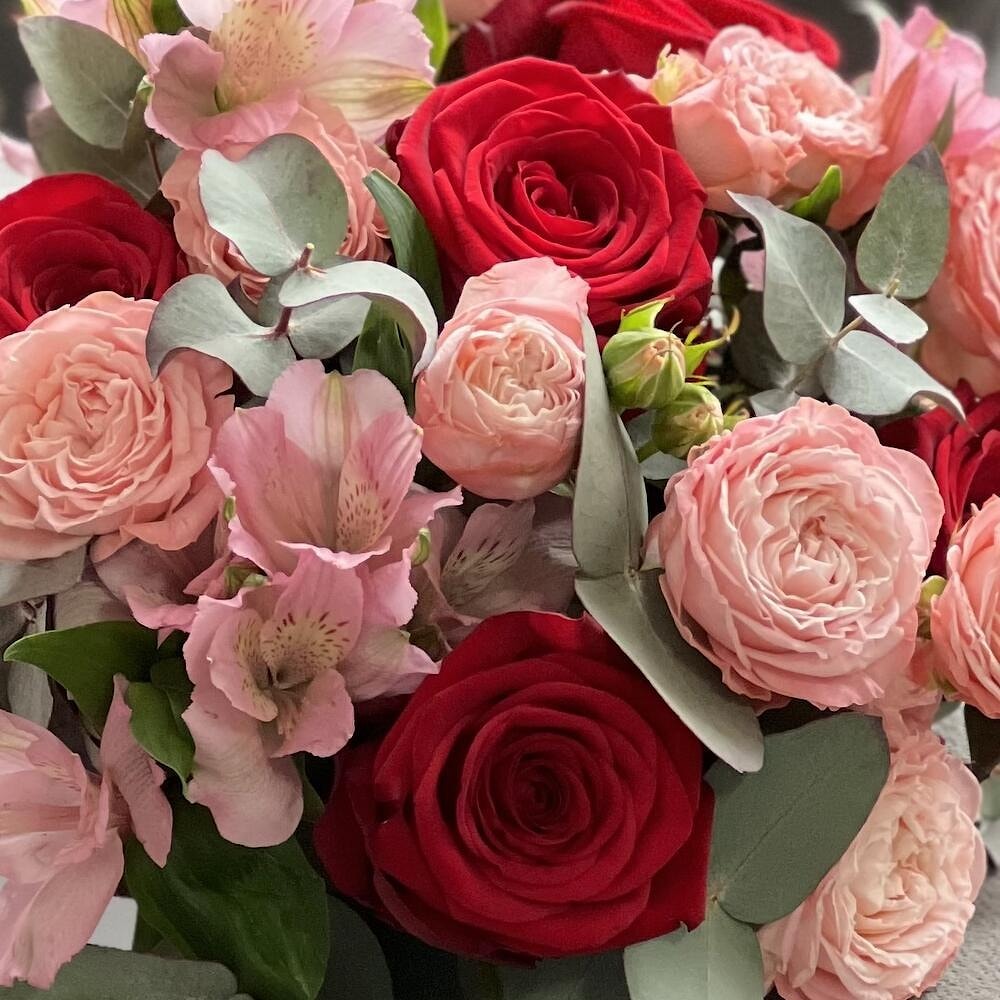 В самом сердце этого букета находятся великолепные красные розы «Фридом» и пионовидные розы «Мадам Бомбастик» - символы любви, восхищения и уважения. Они окружаются розовой альстромерией и эвкалиптом, которые дополняют их красоту и восхищение.