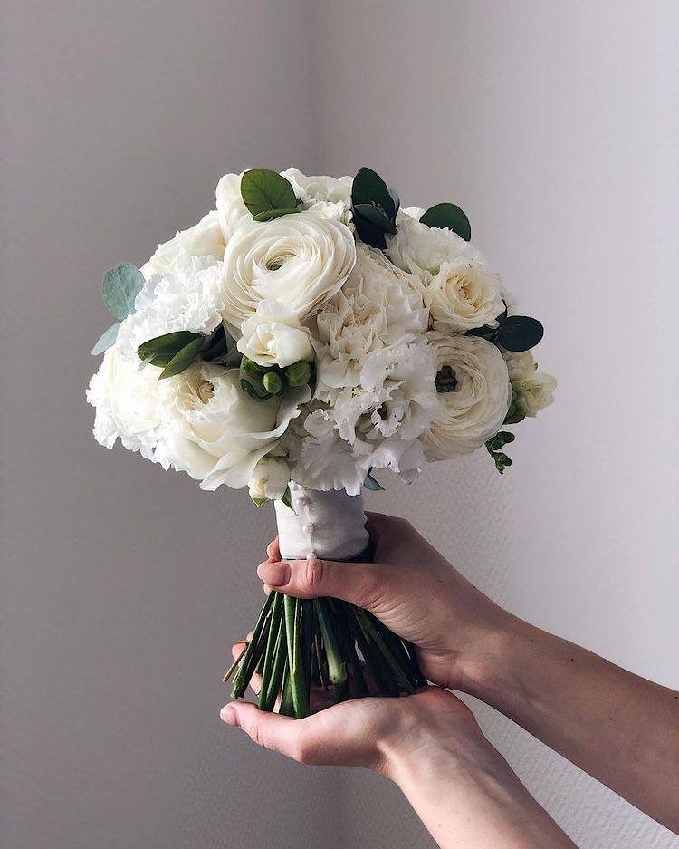 Стильный букет украшен светло-зелеными листьями эвкалипта, которые придают аромат и положительную энергию. Выберите этот букет для свадьбы, чтобы создать романтичное настроение и произвести незабываемое впечатление на всех гостей.