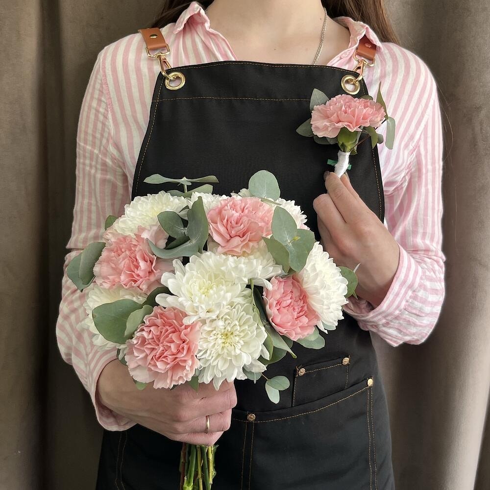 Хризантемы придают букету воздушность и объем, а гвоздики добавляют изысканности и романтики. Эти цветы славятся своей стойкостью, поэтому букет сохранит свежесть на протяжении всего свадебного дня и останется таким же прекрасным на фото.