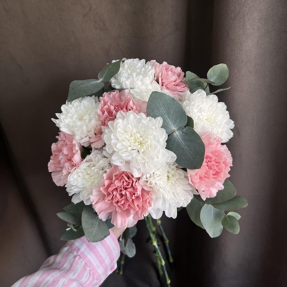 Состав букета: хризантема белая - 4 шт, эвкалипт, диантус розовый - 5 шт.