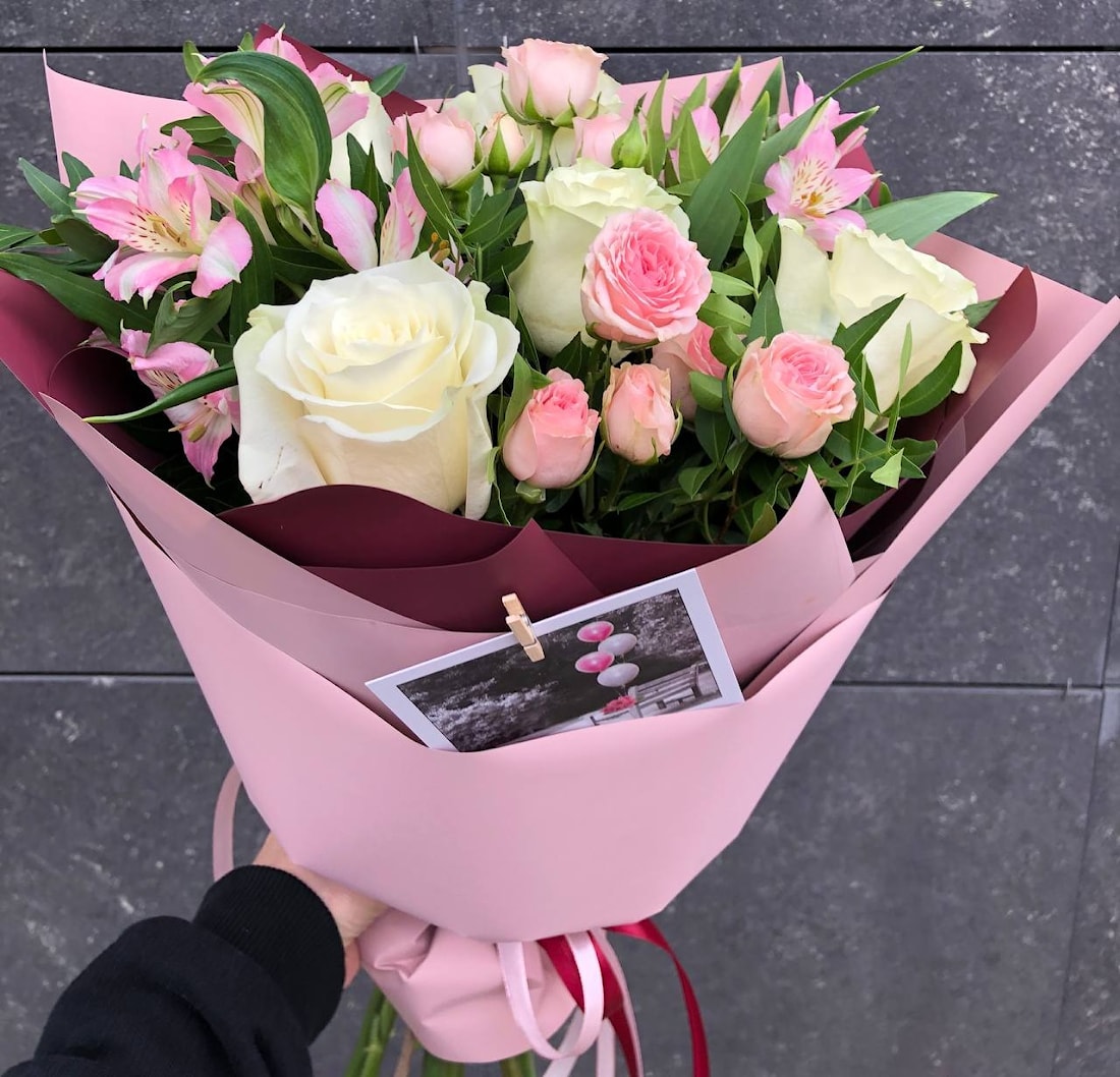 Состав: роза 5 шт, кустовая роза 2 шт, альстромерия 2 шт, зелень.