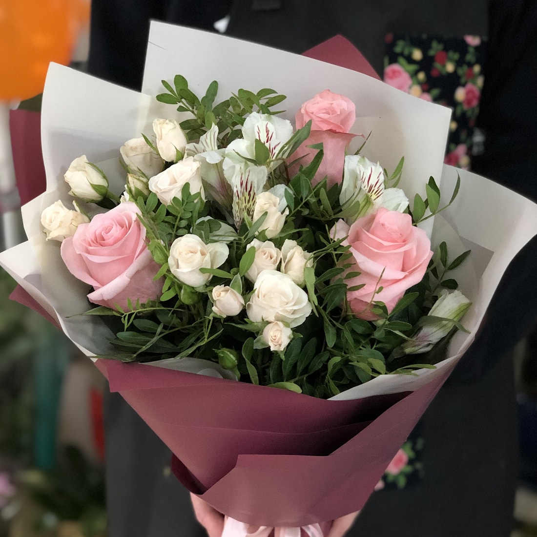 Состав: роза, кустовая роза, альстромерия, зелень.