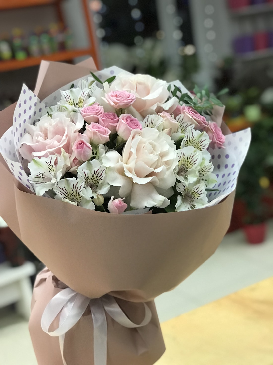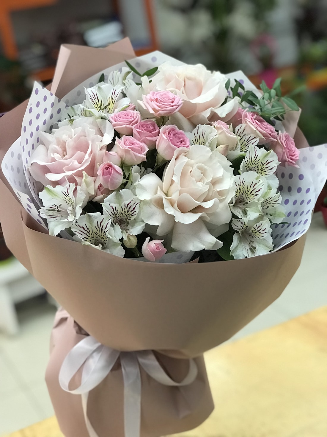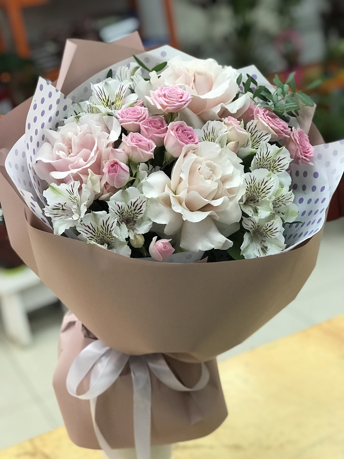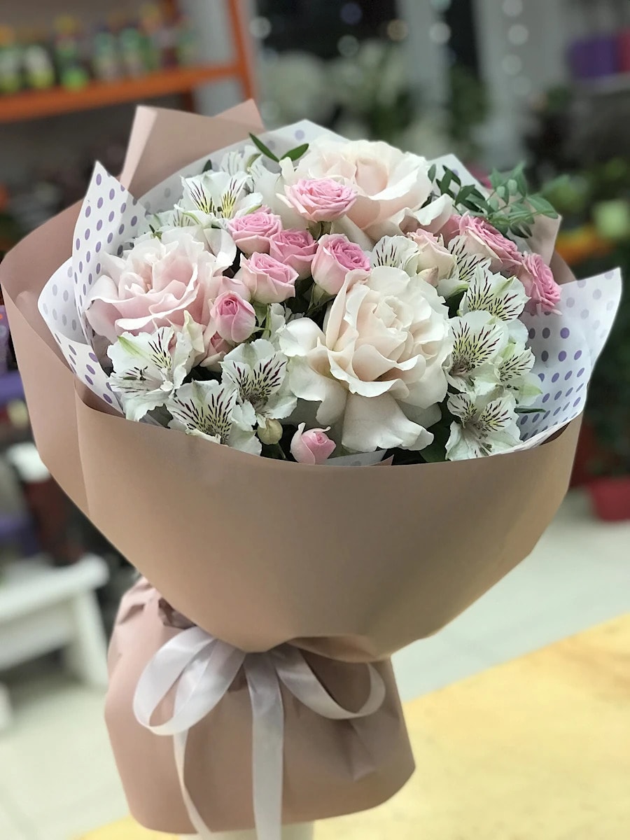 Состав: французская роза, кустовая роза, альстромерия, зелень.