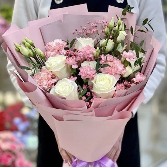Состав Букета "Симпатия 2.0" - роза, гвоздика, эустома, гипсофила, зелень.