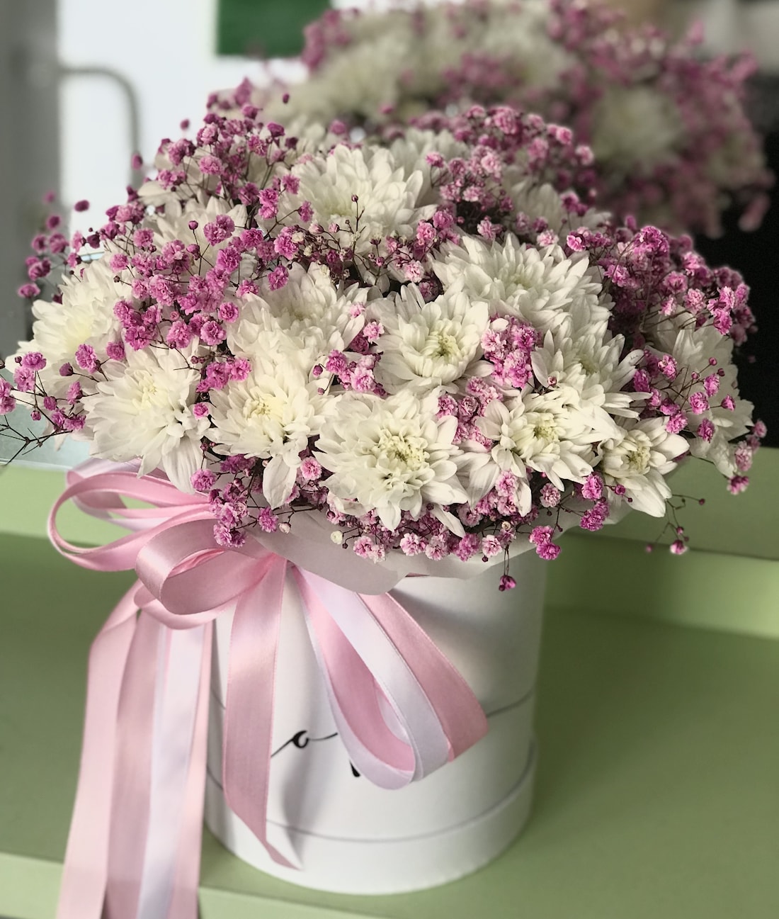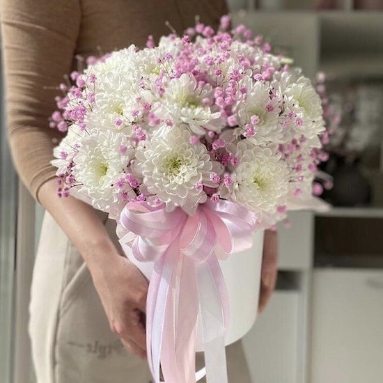 Состав: хризантема - 5шт, гипсофила - 3шт.