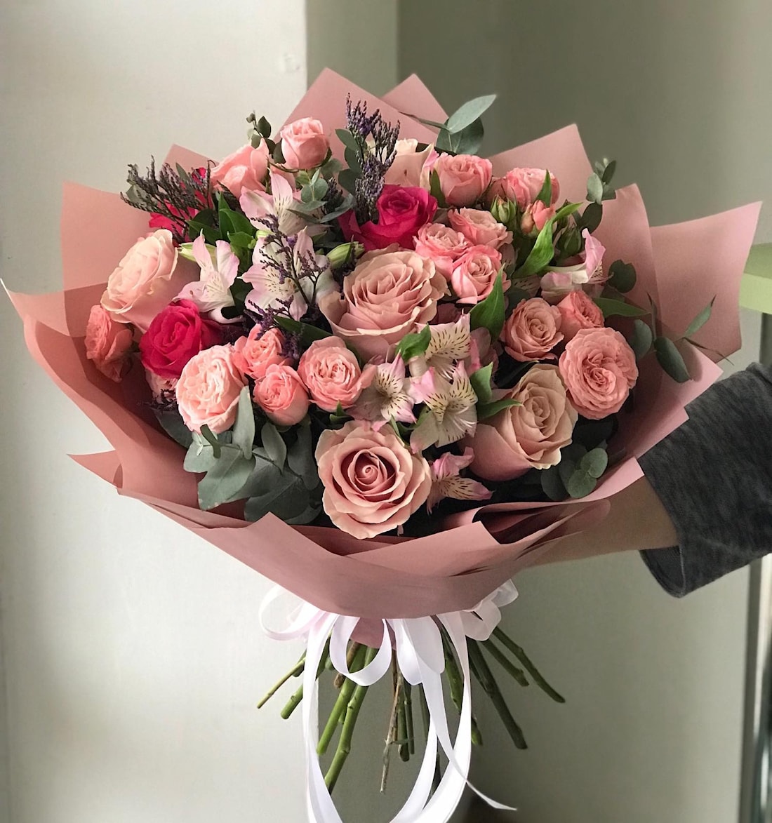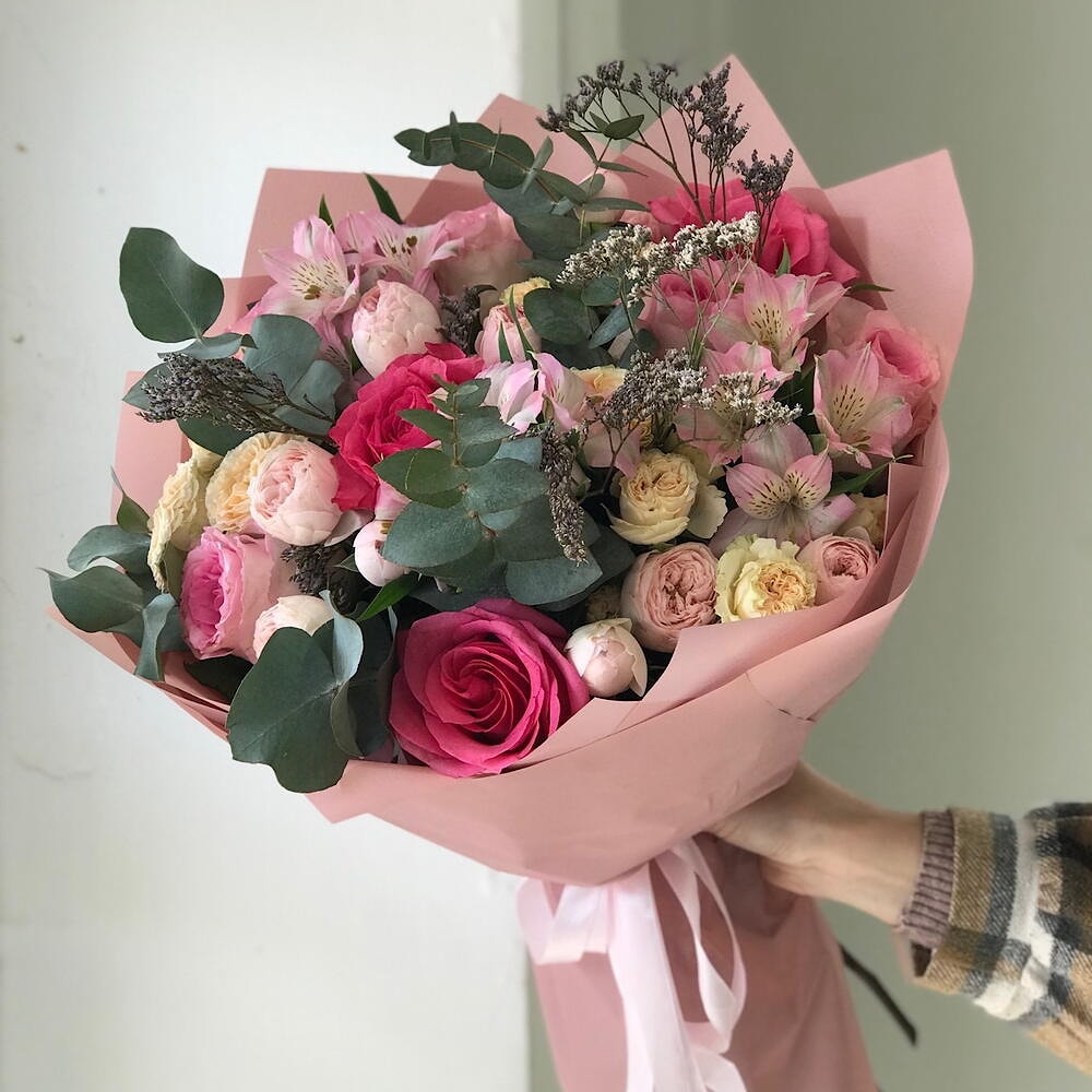Состав: роза, кустовая роза, альстромерия, эвкалипт, лимониум