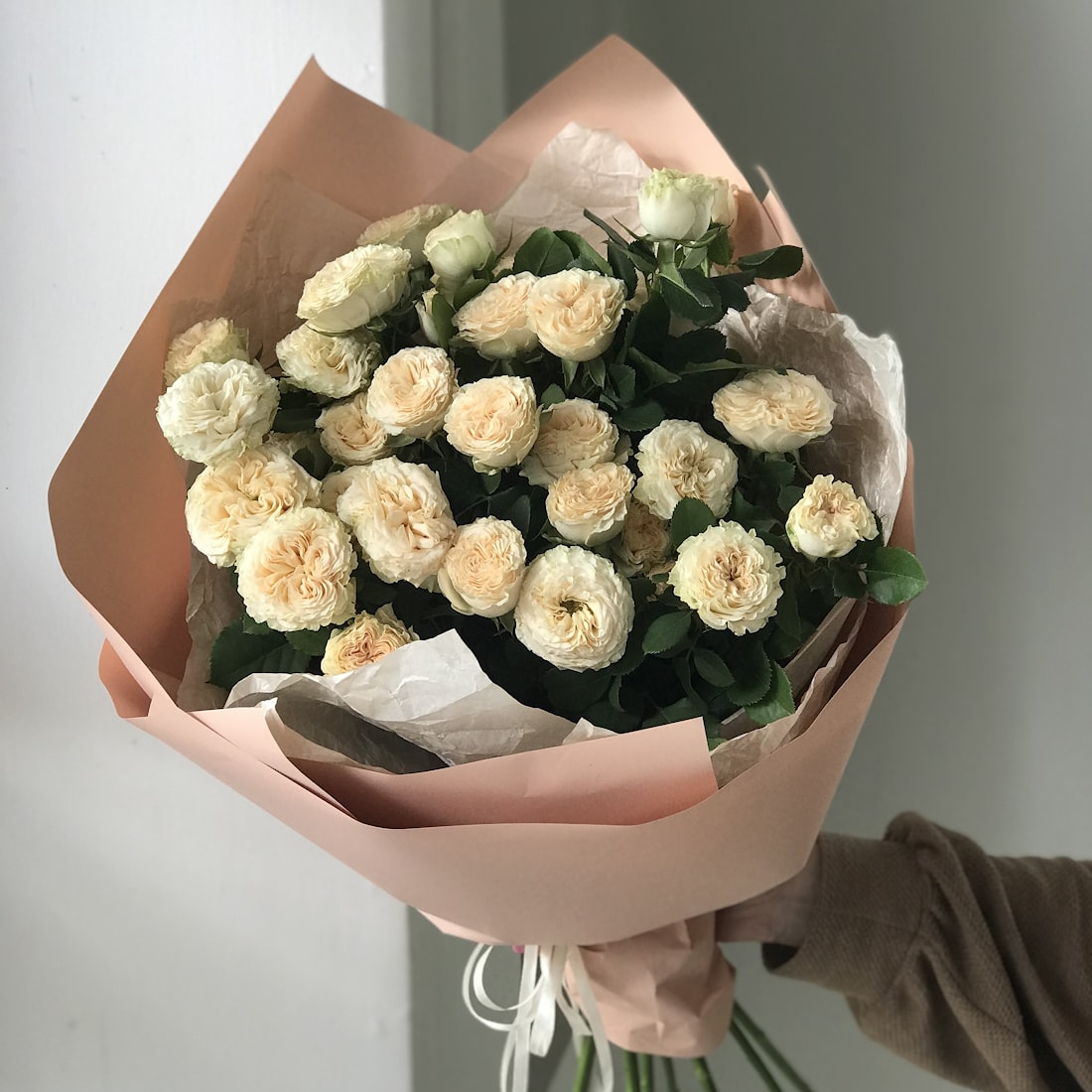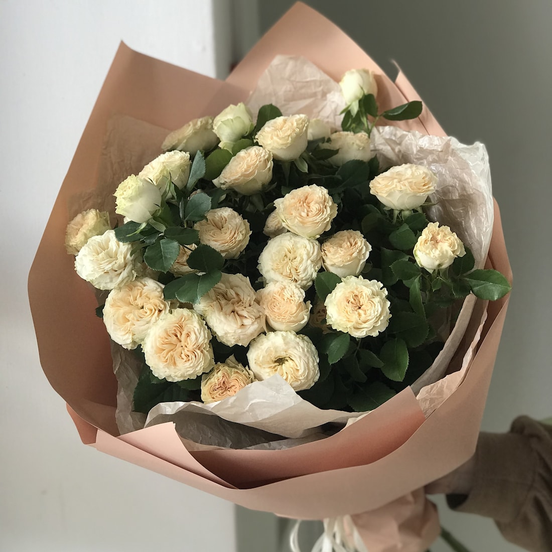 Элегантный моно-букет из пионовидных кустовых роз кремового цвета "Summer" - идеальный подарок для выражения чувств и создания праздничного настроения.