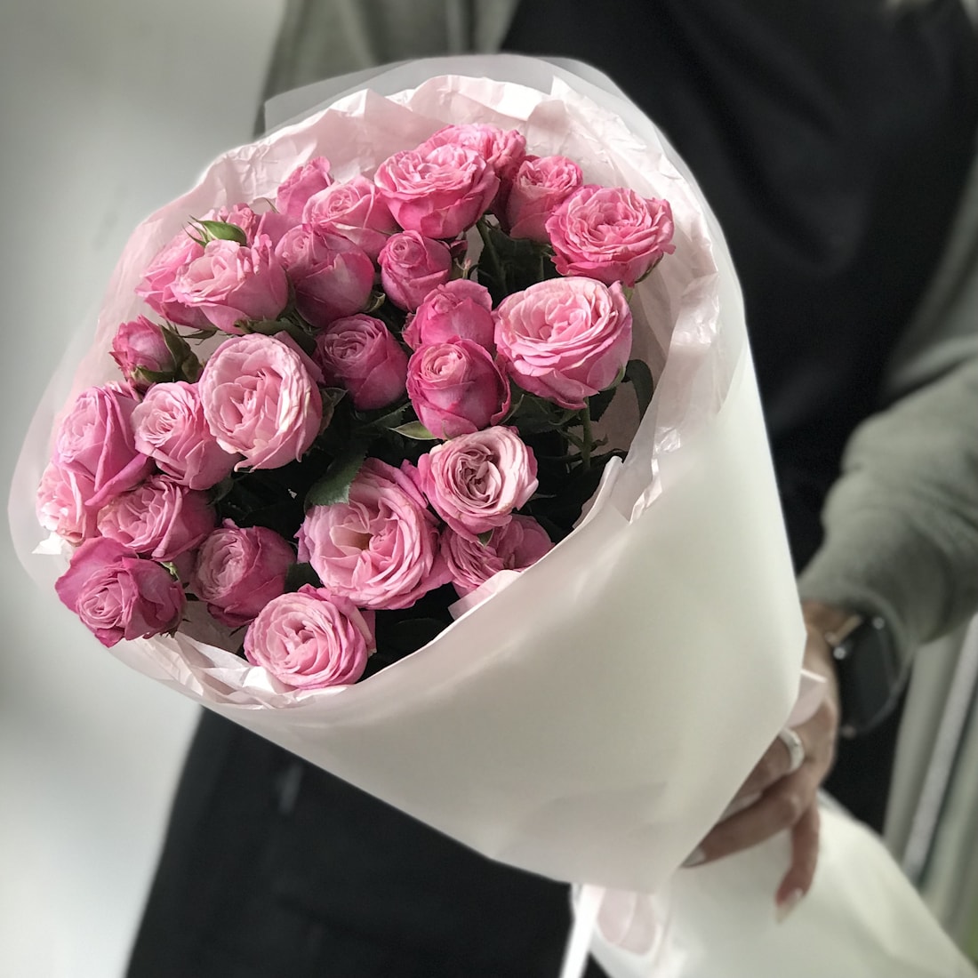 Стильный букет из пионовидных кустовых роз Бомбастик. Идеален как подарок для самой утончённой женщины — той, что любит романтику, стиль и внимание к деталям.