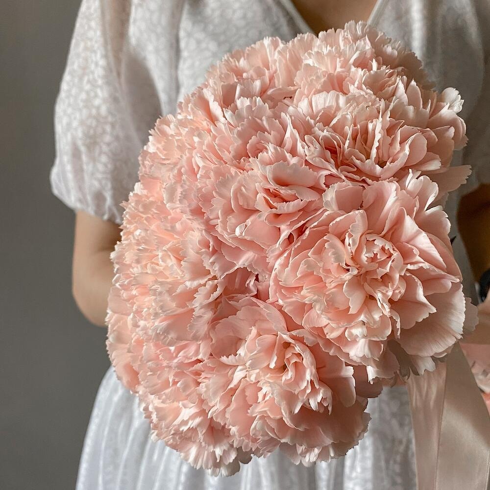 Изысканный букет из 15 персиковых гвоздик — идеальный выбор для нежной и романтичной невесты. Персиковый оттенок символизирует тепло, искренность и душевную гармонию, подчеркивая утонченную красоту и легкость образа в день свадьбы.