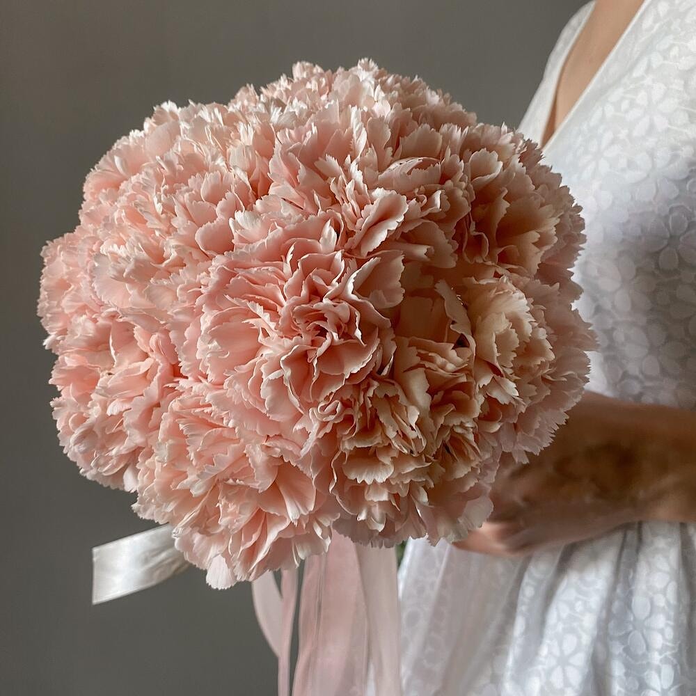 Каждая гвоздика бережно отобрана и аккуратно оформлена, чтобы создать элегантную композицию, которая дополнит как классическое, так и современное свадебное платье.
