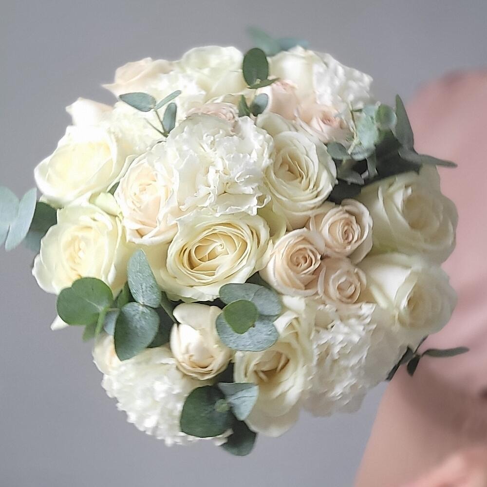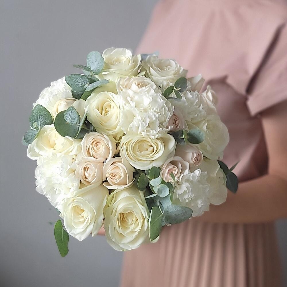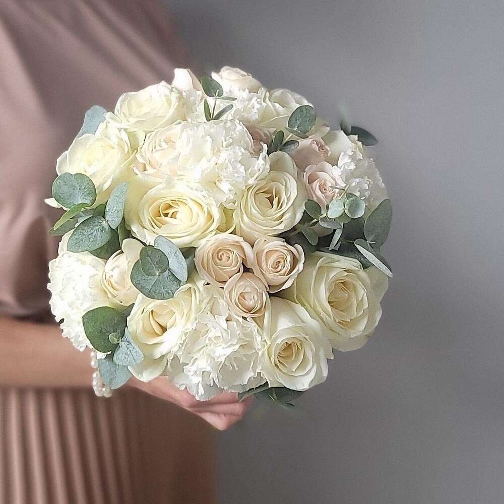 Букет из белых роз, белого диантуса и эвкалипта — это классика в современном прочтении. Идеально подойдёт для торжества в любом стиле: от утончённой городской свадьбы до камерной церемонии на природе.