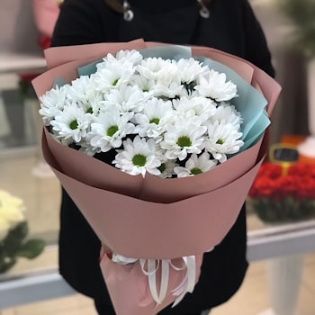 Изысканный букет из 9 белых хризантем — это универсальный подарок, который подойдёт для любого повода. Белоснежные соцветия хризантемы олицетворяют чистоту чувств, заботу и внимание. Такой букет дарят тем, кто дорог сердцу — маме, подруге, коллеге или любимому человеку.